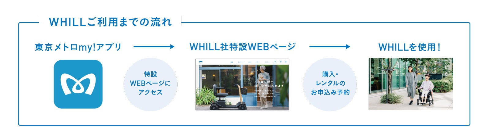 このサービスは、東京メトロの公式アプリから、WHILL社特設WEBページにアクセスし、WHILL社が提供する近距離モビリティWHILLの購入やレンタル(月額/日額)を検索、お申し込みいただけるもので、通常よりもお得な価格で利用することが可能です。WHILLを活用することにより、長距離の歩行や体力に不安がある方や、シニア世代などにとって、都内の買い物や通院などの日常の外出や、ご家族・友人とのお出かけがより快適になるよう今回提供開始するサービスによって両社がサポートいたします。