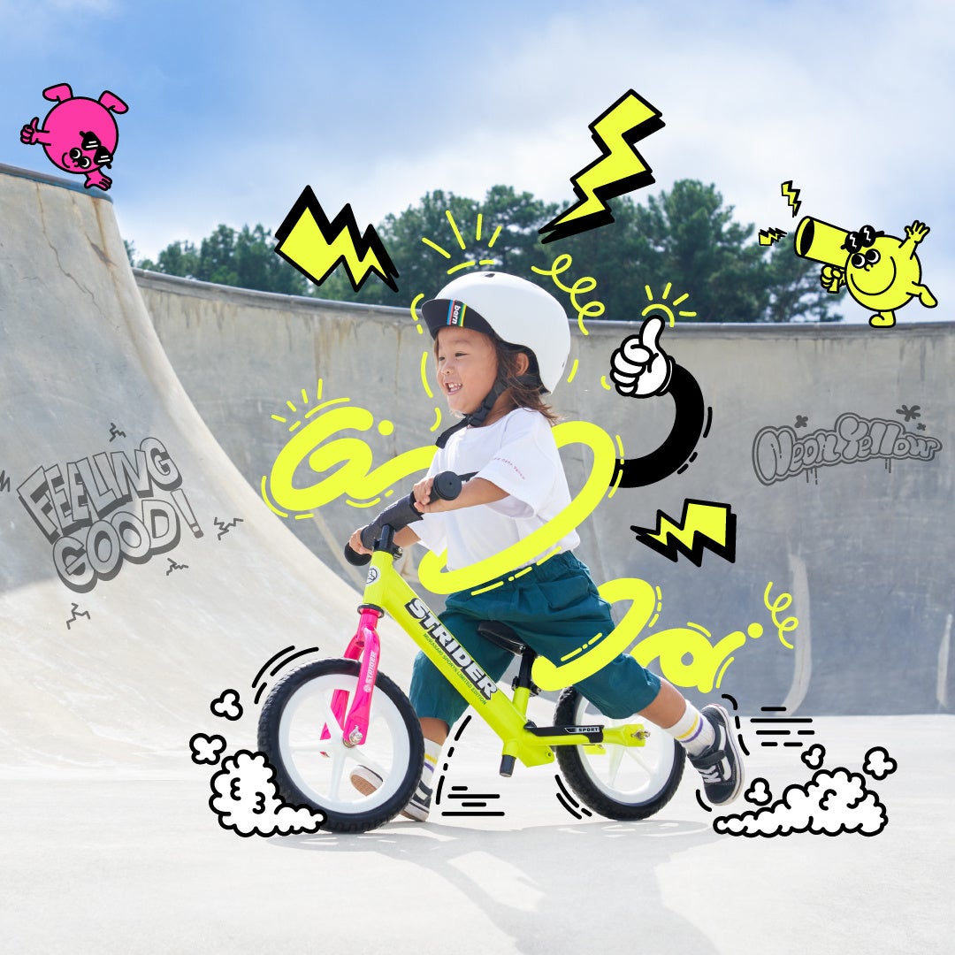 STRIDER®は、世界25ヶ国、400万人以上の子どもたちに愛されているただひとつのランニングバイクです。ストライダーは三輪車や補助輪付き自転車とは違い、子どもたちが、自ら直感的にバランスをとりコントロールする乗り物です。だからこそ、自然とバランス感覚が身につき、体幹も鍛えられ、ココロとカラダが大きく成長する1歳半から5歳の間、子どもたちの好奇心を満たすことができます。