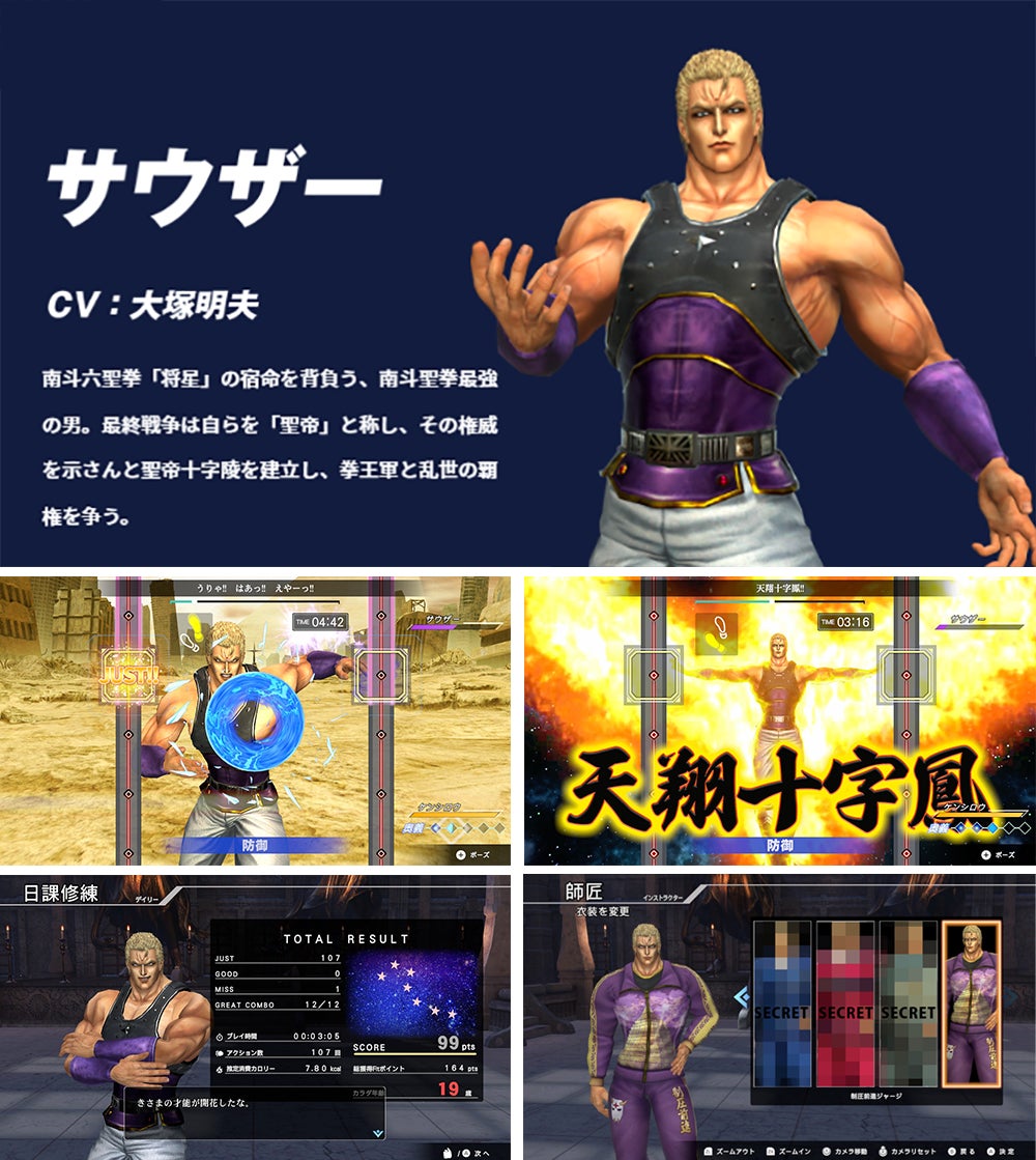 また、「ボスバトル」でサウザーを倒すと、“師匠 インストラクター”として使用することが可能になります。「すぐに支度せよ!」「今日も聖帝と共にいくぞ!」「きさまの才能が開花したな」などの“聖帝”の叱咤激励を受けながら、日々のエクササイズをお楽しみください。本作でしか見られないサウザーの衣装も必見です。