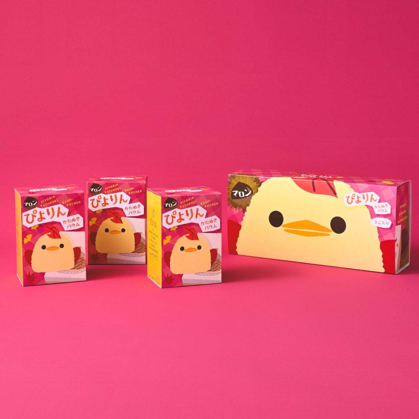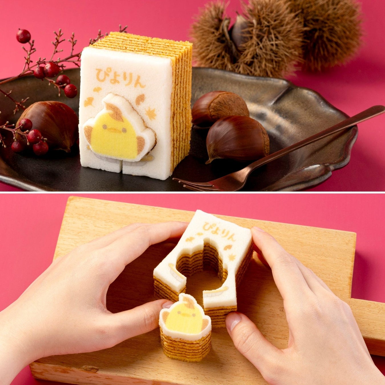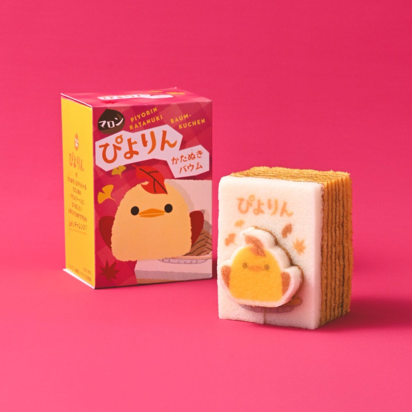 しっとりと焼き上げたバウムクーヘンに、卵白仕立ての白いパウンド生地を重ね、秋のぴよりんを描きました。絵柄のまわりには切り込みが入っており、ぴよりんを型ぬきしながら食べる、遊び心のあるお菓子です。