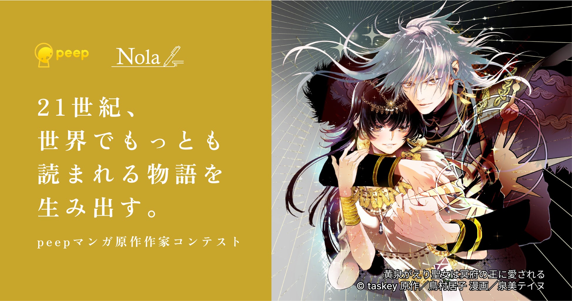 マンガ・ノベルアプリ「peep」の開発・運用や、マンガ制作・原作の開発や提供を行うtaskey株式会社(本社:東京都渋谷区、代表取締役CEO:大石 ロミー)は、作家と企業をつなぐ創作プラットフォーム「Nola(ノラ)」を提供する株式会社indent(本社:東京都千代田区、代表取締役社長:釜形勇気)と共同主催で、“ヒットマンガの原作および作家を発掘する”ことを目的とした『peepマンガ原作作家コンテスト』を、7月16日(火)より実施いたします。