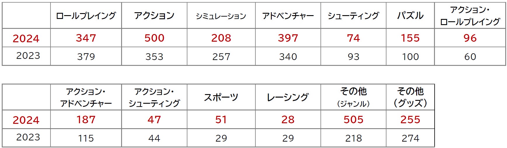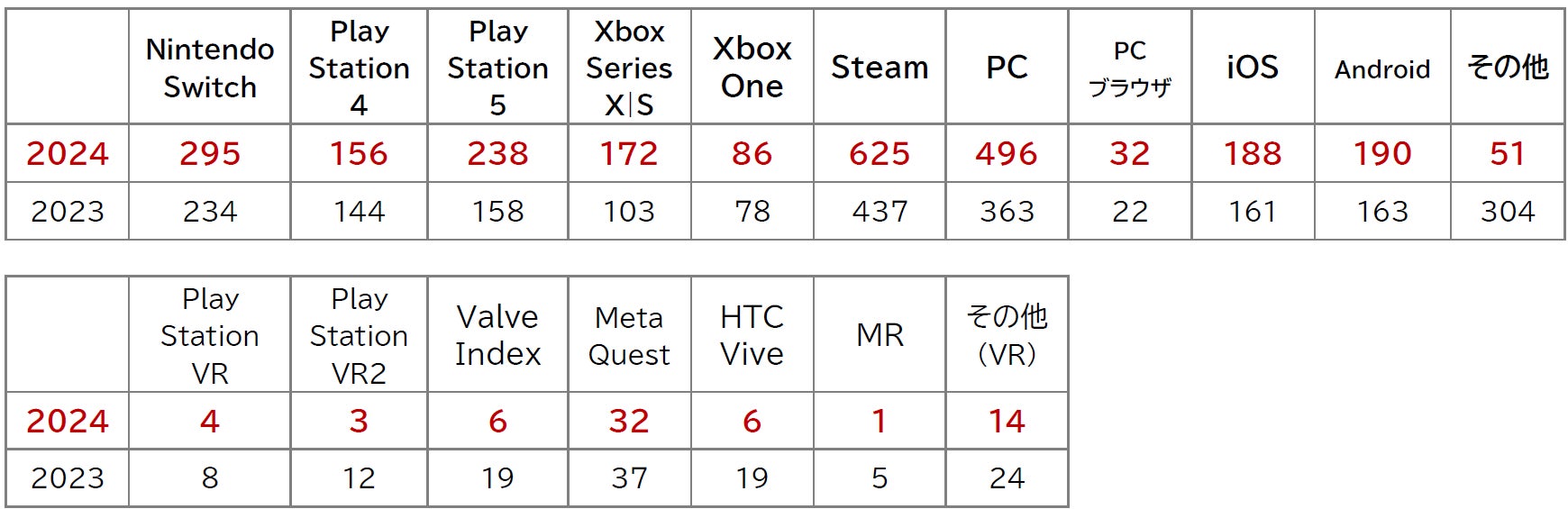 プラットフォーム別の集計では、家庭用、モバイル、PC、VRと、あらゆるプラットフォームに向けたさまざまなゲームが幅広く揃っていることが分かり、ゲームファンの期待に応える充実のラインアップになりました。