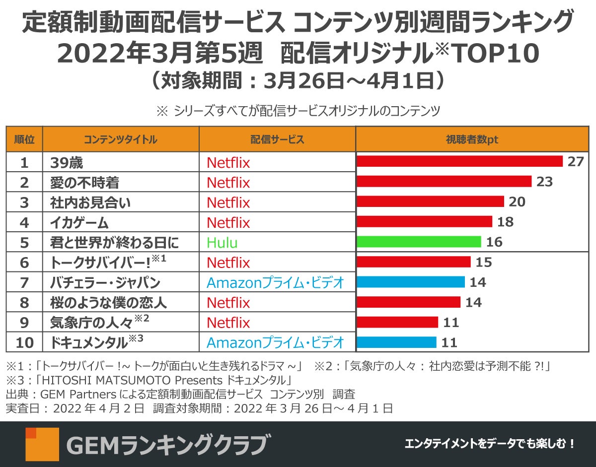 エンタテイメント業界に向けたデータ×デジタルマーケティングサービスを提供するGEM Partners株式会社(ジェムパートナーズ、所在地:東京都港区、代表取締役:梅津文)は4月7日(木)、エンタメコンテンツランキングやデータ情報を発信する「GEMランキングクラブ」プロジェクトにて作成した2022年3月第5週の「定額制動画配信サービス コンテンツ別週間ランキングTOP20(実査日:2022年4月2日、調査対象期間:3月26日~4月1日)」を発表します。