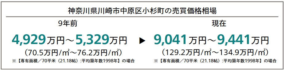 マンションナビのデータによると、武蔵小杉、勝どき、月島の各エリアで、過去9年間で顕著な価格上昇が見られます。