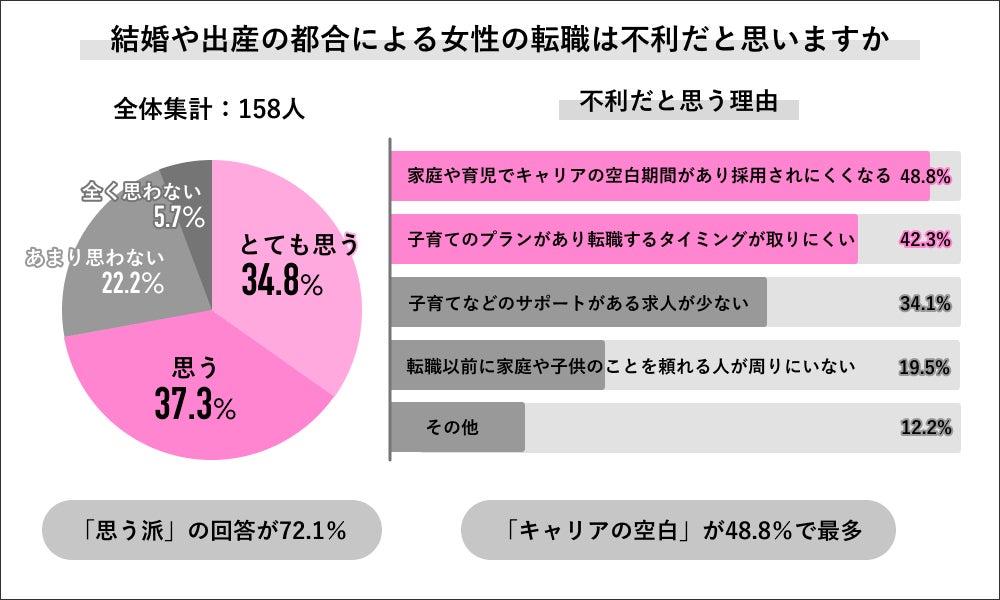 また結婚や出産は女性の転職にどのように影響するかについて聞くと、「とても不利だと思う」34.8%と「不利だと思う」37.3%を合算した72.1%が”不利と思う派”の回答をしました。