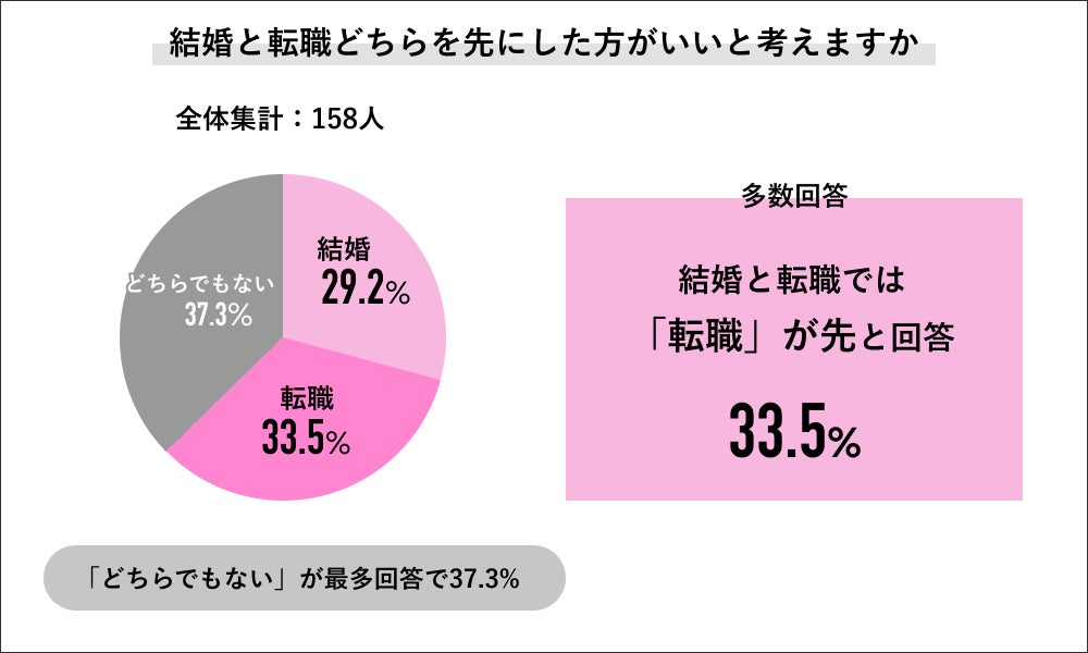 ライフイベントでキャリアの選択を迫られる女性にとって、結婚と転職どちらを先にした方が良いと考えるかについて聞くと、「転職」が33.5%で「結婚」は29.2%でした。