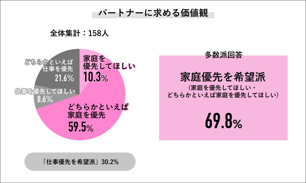 パートナーに求める仕事と家庭の優先度を聞くと、「家庭を優先してほしい」10.3%と「どちらかといえば家庭を優先してほしい」59.5%を合算した、69.8%が”家庭優先希望派”に回答しました。”仕事優先希望派”の回答は30.2%でした。