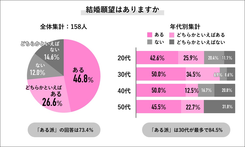 自身の結婚願望ついて聞くと、「ある」46.8%と「どちらかといえばある」26.6%を合算した73.4%が”ある派”の回答をしました。”ない派”の回答は26.6%で、内訳は「ない」12.0%、「どちらかといえばない」14.6%でした。またこの結婚願望の有無を年代別で見ていくと、”ある派”の回答は30代が84.5%で最多で、次いで20代が68.5%、50代が68.2%で、”ある派”の回答で最も少なかったのは40代の62.5%でした。