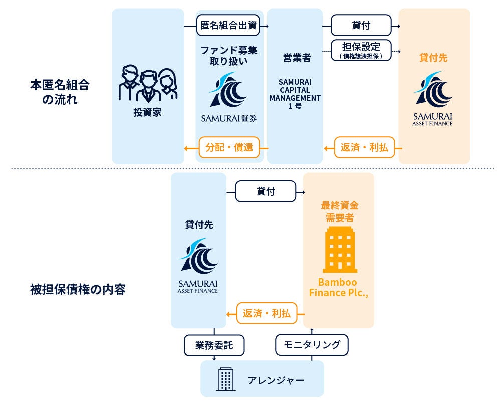 このファンドは、SAMURAI CAPITAL MANAGEMENT1号合同会社(以下、「営業者」といいます。)がSAMURAI ASSET FINANCE株式会社(以下、「貸付先」といいます。)に対して貸付(以下、「本件貸付」といいます。)を行う貸付型クラウドファンディングとなります。本件貸付では貸付先が実施したBamboo Finance Plc.(以下、「Bamboo」といいます。)への貸付債権を被担保債権として債権譲渡担保を設定します。