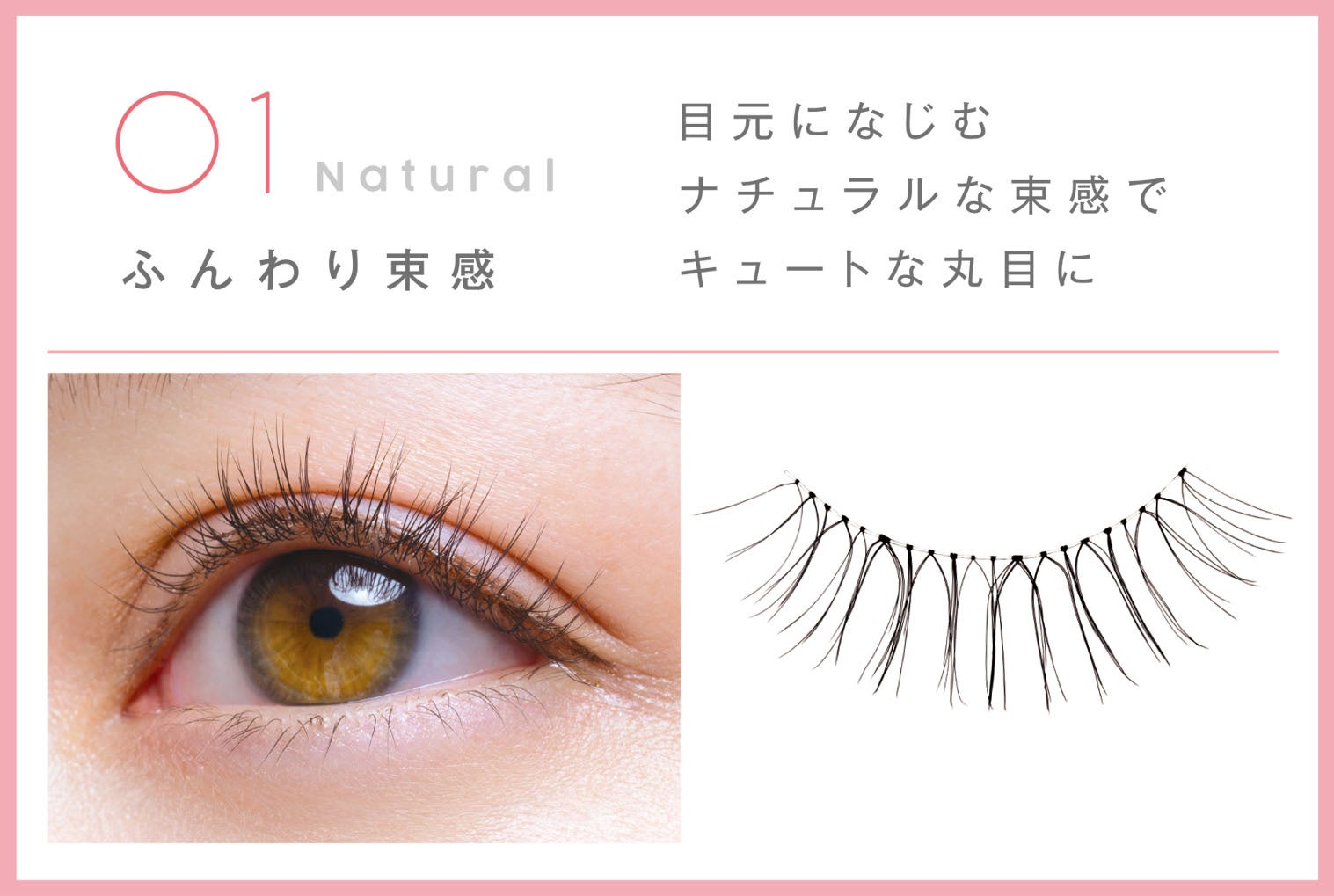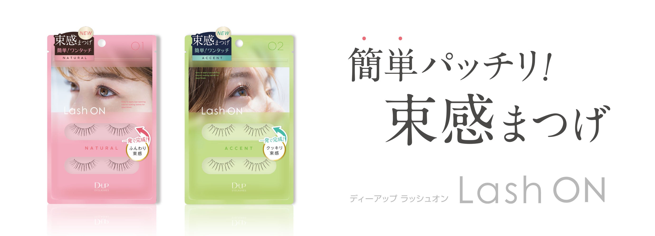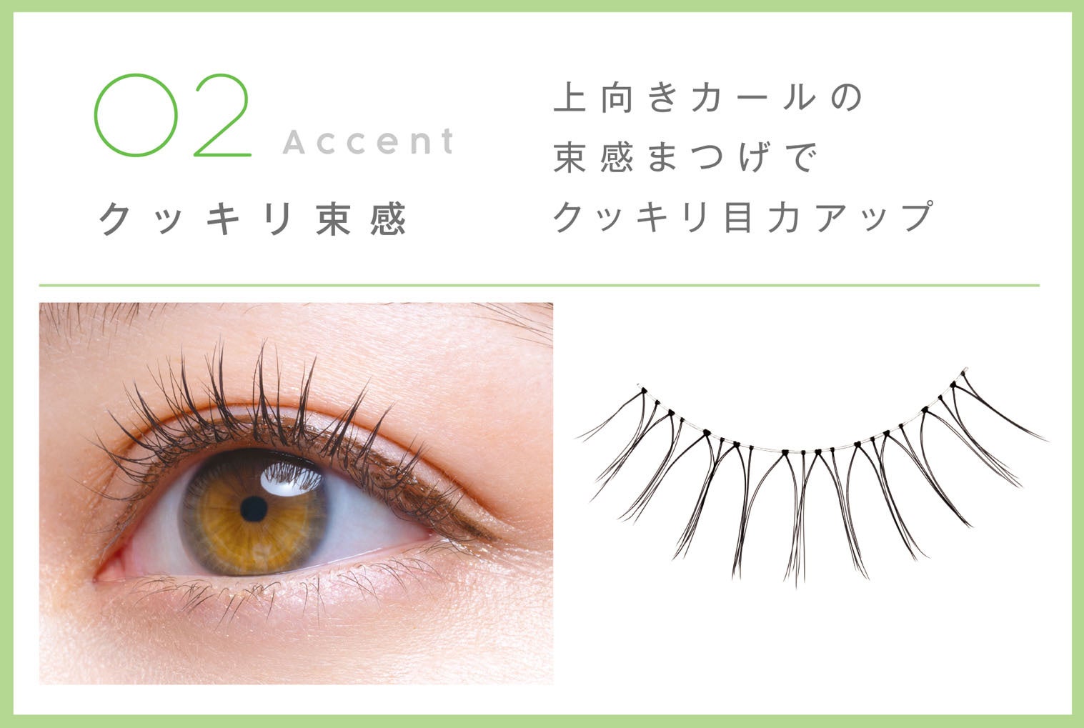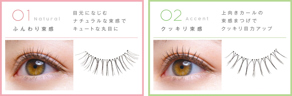 「ナチュラル」と「アクセント」の2種類のデザインで、メイクや気分に合わせて好みの束感まつげをお選びいただけます。