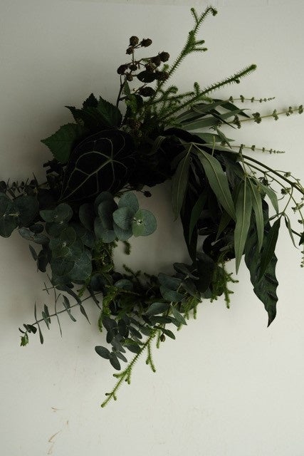 旬のグリーンを使い、生のフレッシュな状態からドライに変化していく過程を楽しんでいただけるリースのWORKSHOPです。