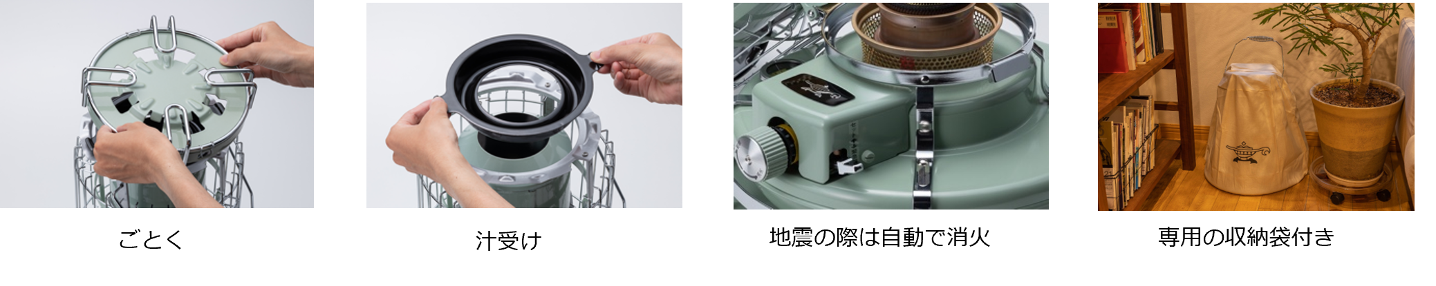 90年以上もの間愛され続けるアラジンブランドの代表作である「ブルーフレームヒーター」。美しい青い炎は、ムラなく気化された灯油が充分な酸素を取り込んだ良い燃焼状態である証拠です。対流式なので暖められた空気がお部屋をくまなく、ふんわりと包み込み、気になる風や音もありません。そんな伝統の青い炎、心地よい暖かさはそのままに、煮炊きとしても使えるように調理機能を追求したのが「ブルーフレームクッカー」です。暖房器具としてだけでなく、ごとくの上に鍋、やかんなどを置け、「煮る」、「焼く」、「炊く」と、幅広い調理に大活躍します。