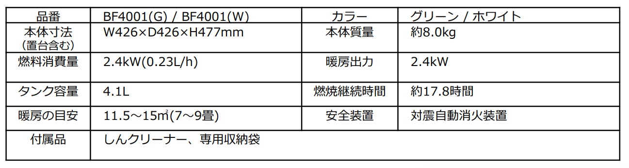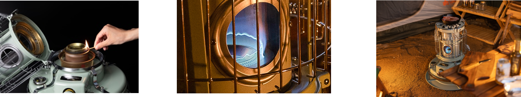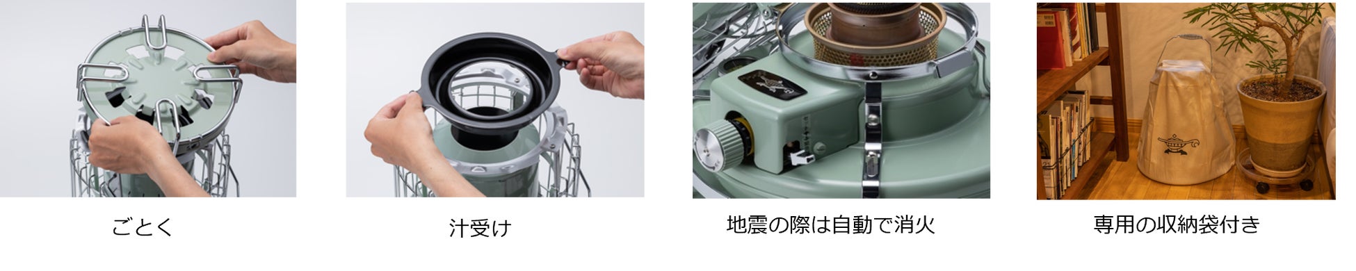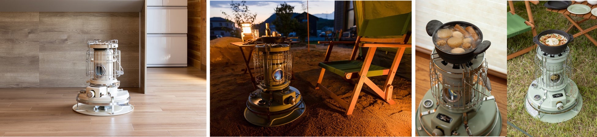 最大で約18時間燃焼を継続するため、室内はもちろん、寒い時期のアウトドアも快適に過ごすことができます。また、燃料である灯油が燃焼する際に、大量の水蒸気が発生することにより、暖房中に空気が乾燥しないところも特長のひとつです。さらに、サイズはアウトドアにも持ち運びやすいコンパクトにして使いやすさを実現しました。