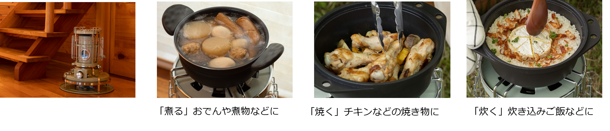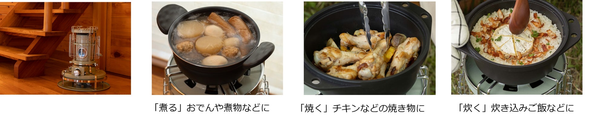煮炊き暖房用石油こんろ『アラジン ブルーフレームクッカー』は、「永遠のスタンダード」と称され、90年以上愛され続けるブルーフレームヒーターの青い炎を囲み、“暖をとりながら料理もしたい”というお客様の声をかたちにするため開発しました。伝統の青い炎・心地よい暖かさはそのままに、煮炊きとしても使えるように調理性能を追求し、鍋ややかんを置くことで、「煮る」、「焼く」、「炊く」など様々な調理ができます。