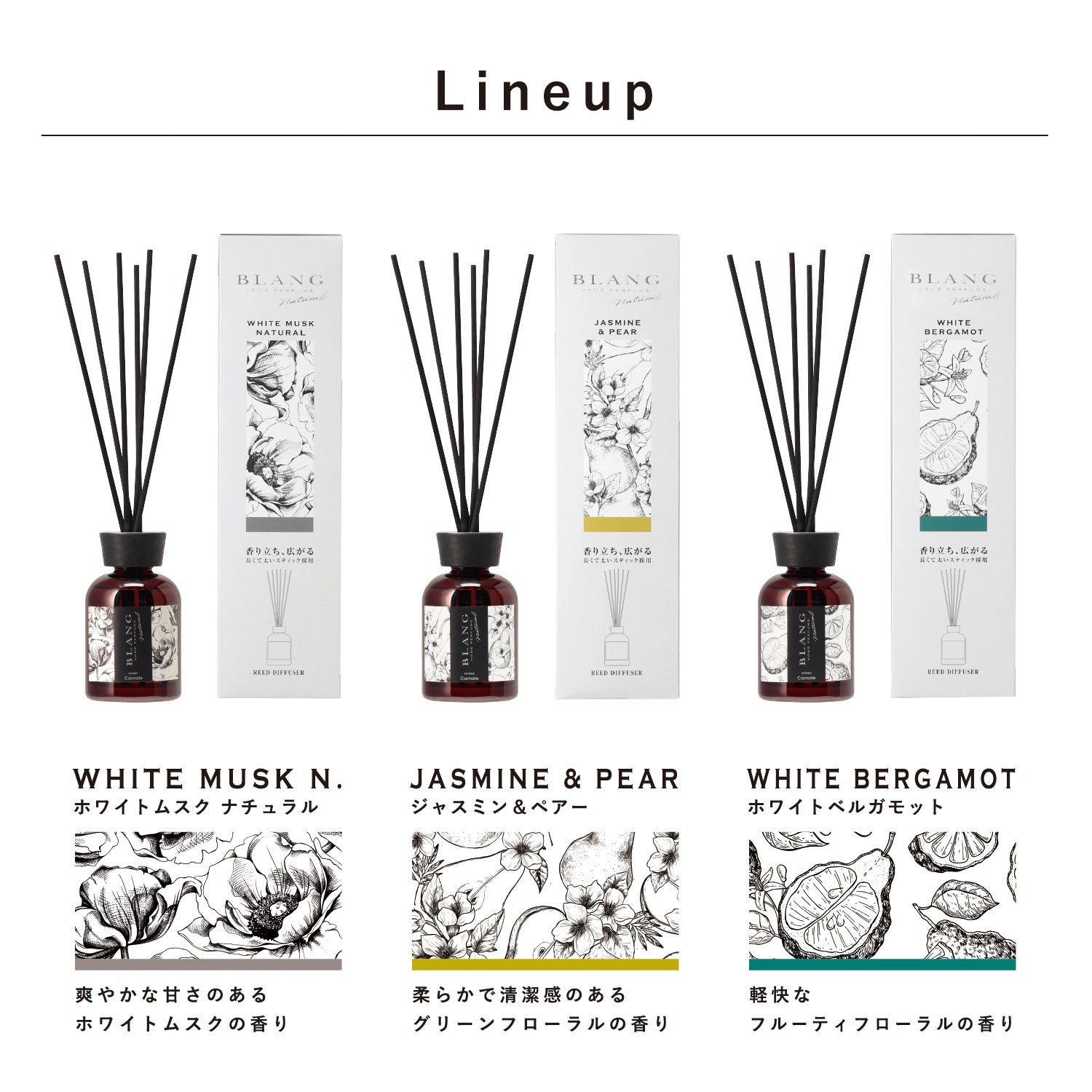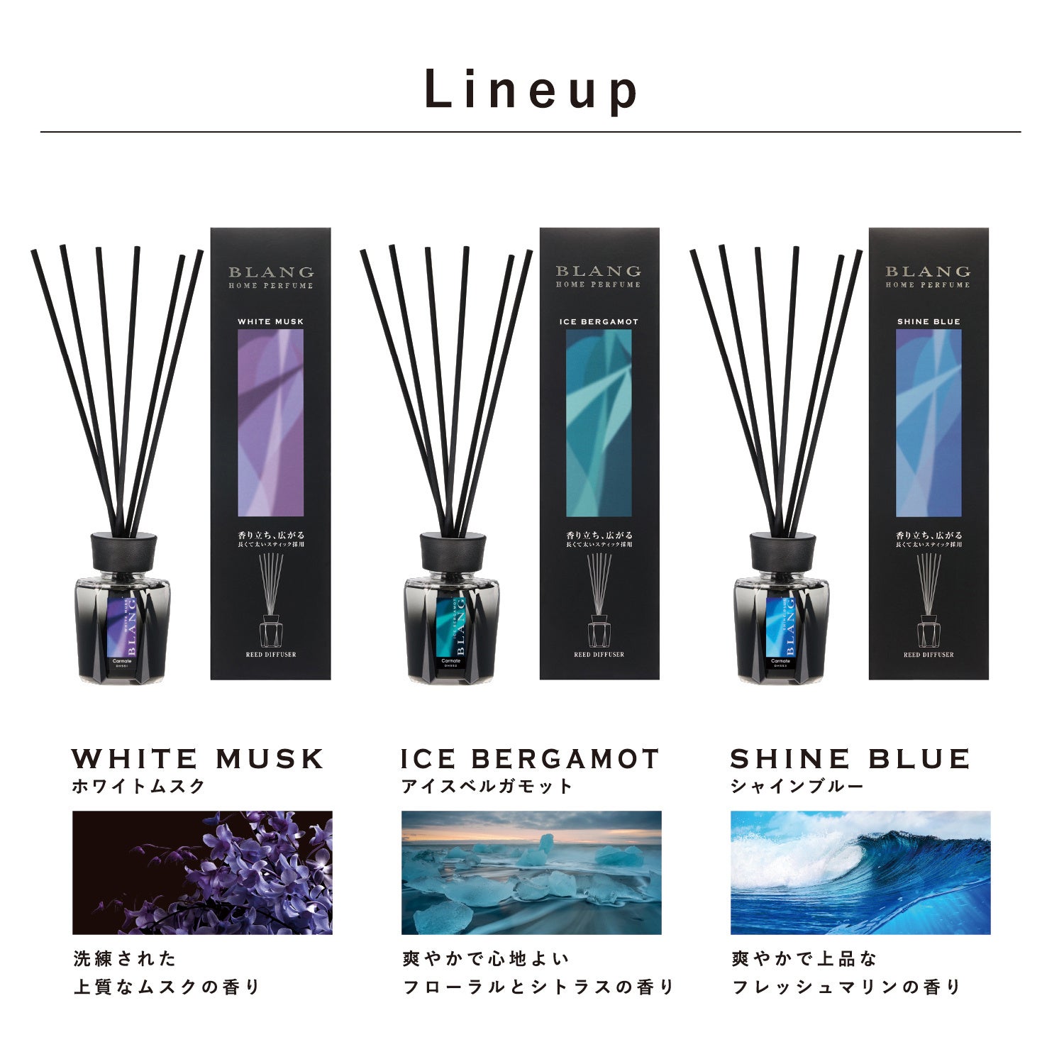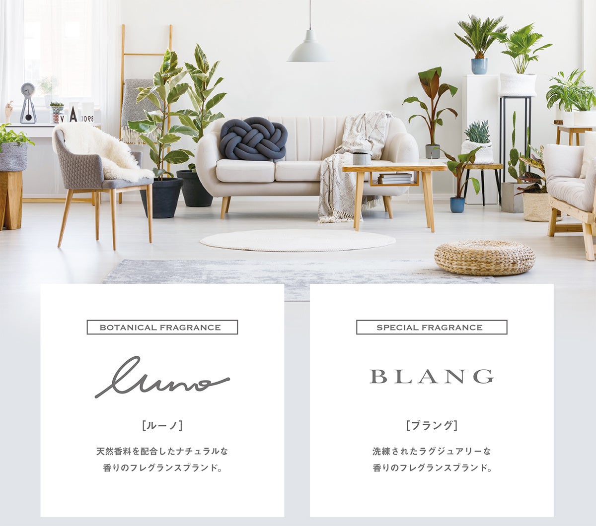 スティックの広がりをキープし、効率よく香りを拡散する『ブラング リードディフューザー』(2022年7月発売)を中心に、『BLANG(ブラング)』シリーズと『luno(ルーノ)』シリーズからお部屋で香りを楽しめる新フレグランスのラインナップを展示いたします。