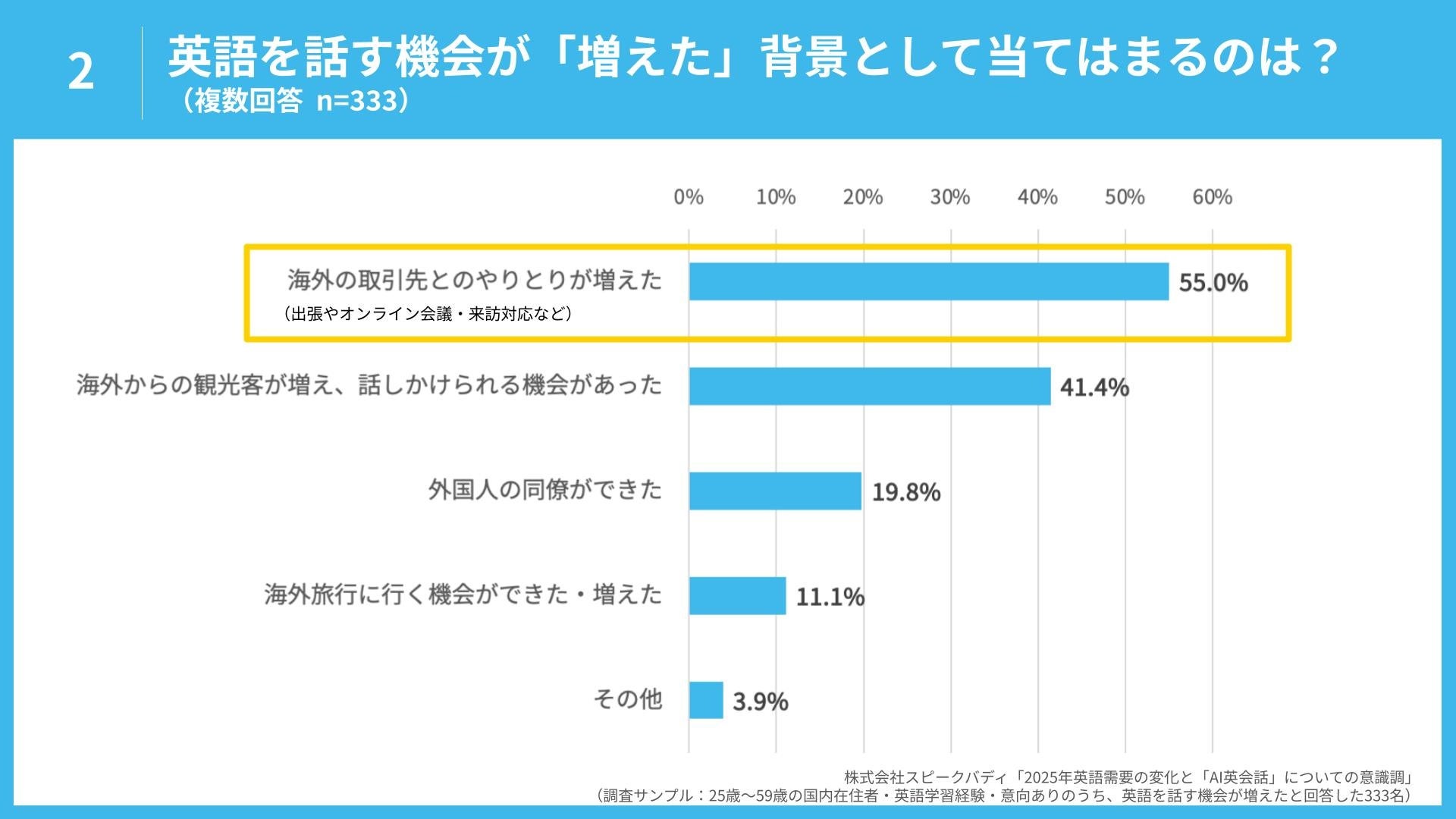 ②増加した理由としては「海外取引先とのやりとりが増えた(55.0%)」「海外からの観光客が増え、話しかけられる機会があった(41.4%)」「外国人の同僚ができた(19.8%)」と続く。2022年以来増加しつづけている訪日客の影響のみならず、コロナ禍を機に定着したオンライン会議や外国人採用増加の影響から、多くの方において英語を話す機会が増えている様子が伺える。
