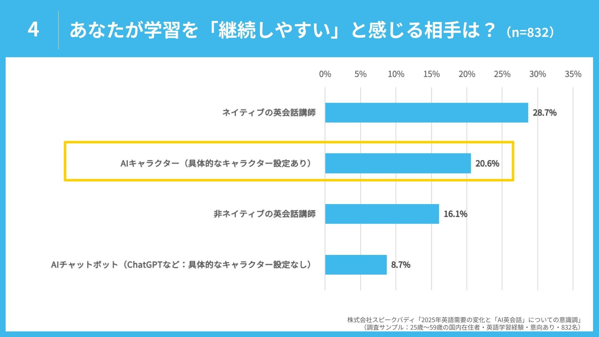 こちらに関連し、今回の調査では「学習を『継続しやすい』と感じる相手は?」と聞いたところ、「ネイティブの英会話講師(28.7%)」に次いで「AIキャラクター(具体的なキャラクター設定あり)(20.6%)」が上位となった。