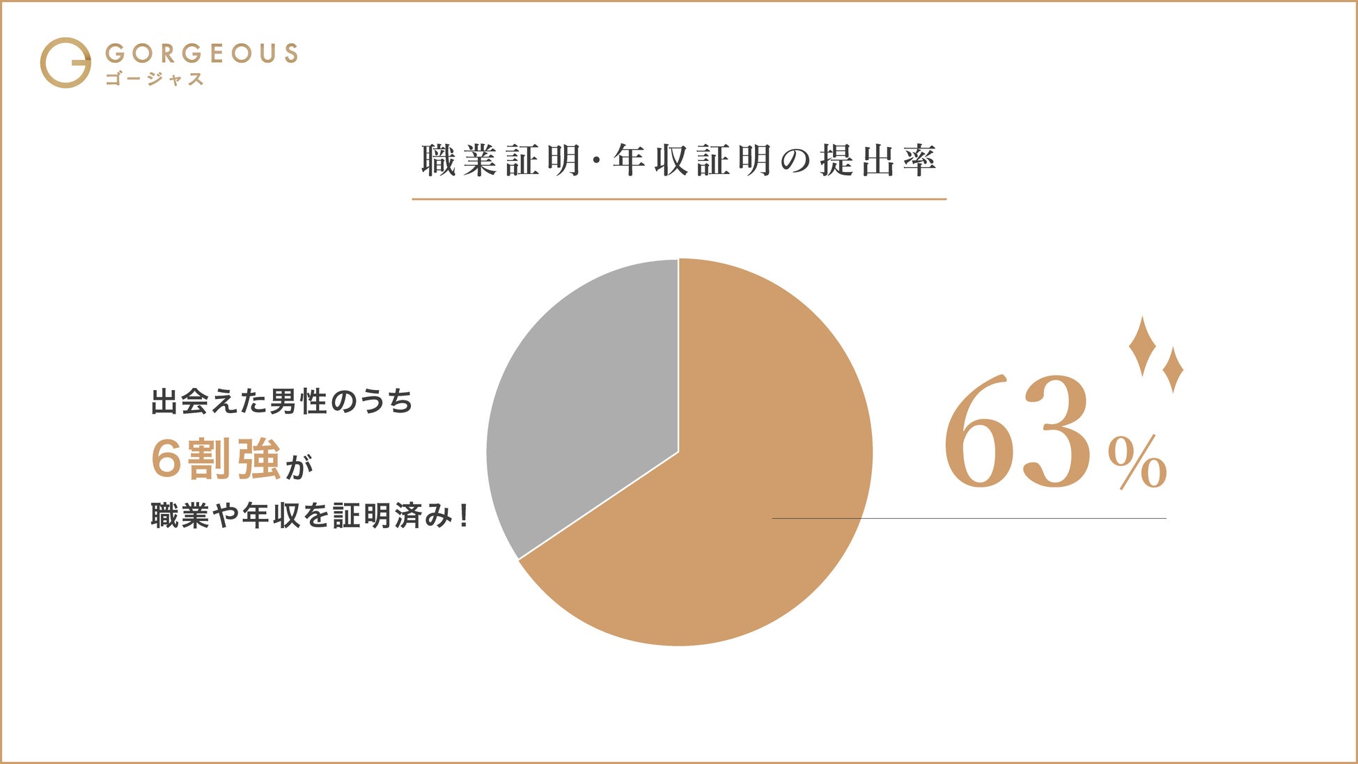 「出会いたい職業の方にゴージャスで出会えた」と回答した男性のうち、63%が「職業証明」もしくは「年収証明」を行っており、自身の魅力の可視化が質の高い出会いを引き寄せていることが分かりました。