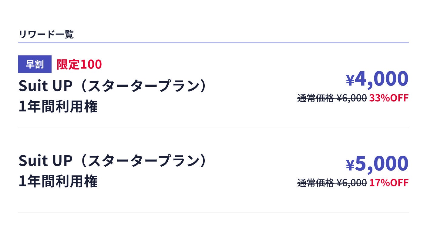 スーツアップ1年間利用権(1ユーザー500円x12ヶ月=6,000円分)の早割として4,000円(33%off)で利用することができます。