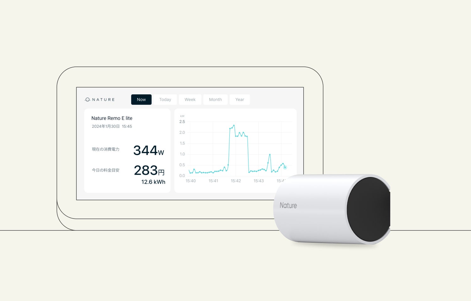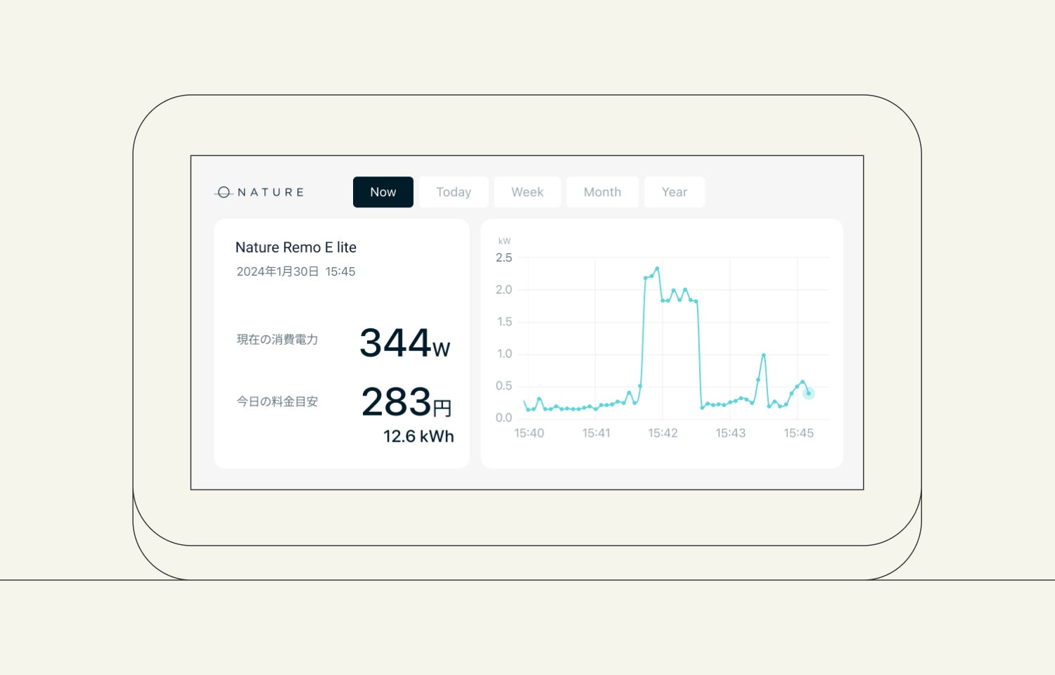 消費電力と電気料金の画面表示は「現在、1日、1週、1ヶ月、1年」単位で切り替えられます。なお、「Now」と「Today」のタブは消費電力(W)を、「Week」「Month」「Year」のタブは1時間あたりの消費電力量(kWh キロワットアワー)をグラフ表示します。また、消費電力は1分おきに更新され、電気料金は「Nature Remo」アプリで自身が設定した料金プランを基に算出した目安料金となります。