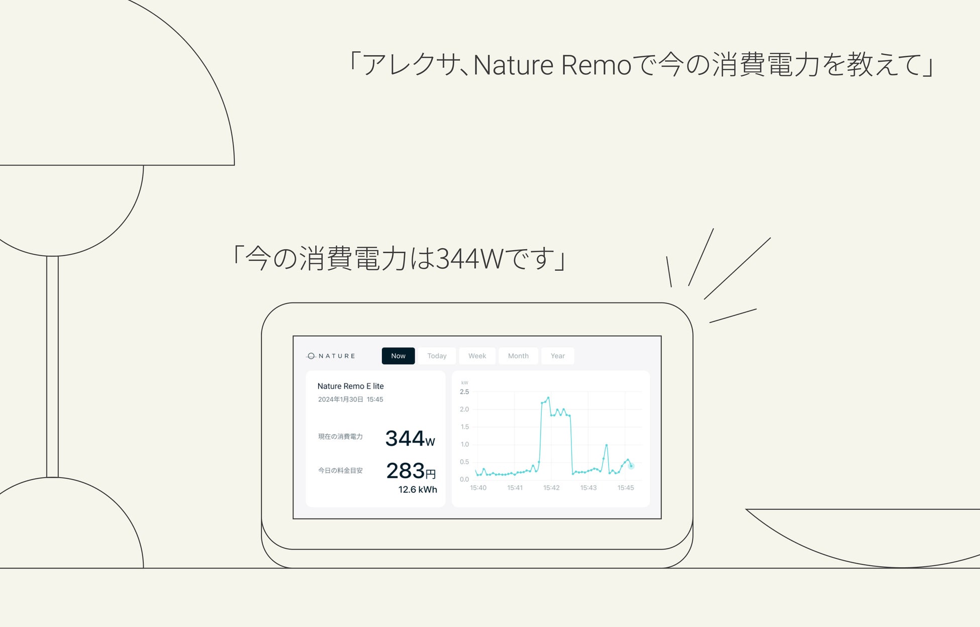 「Alexa」アプリで「Nature Remo E」シリーズと「Alexa」を連携すると、 対応する「Echo Show」に「アレクサ、Nature Remoで今の消費電力を教えて」「アレクサ、Nature Remoで今日の電気料金を教えて」などと音声で呼びかけることで、「Nature Remo E」シリーズで取得した消費電力と算出した電気料金を「Echo Show」の画面にグラフや数値で表示させ、「Alexa」が音声で「今の消費電力は1,000Wです」と読み上げられるようになりました。