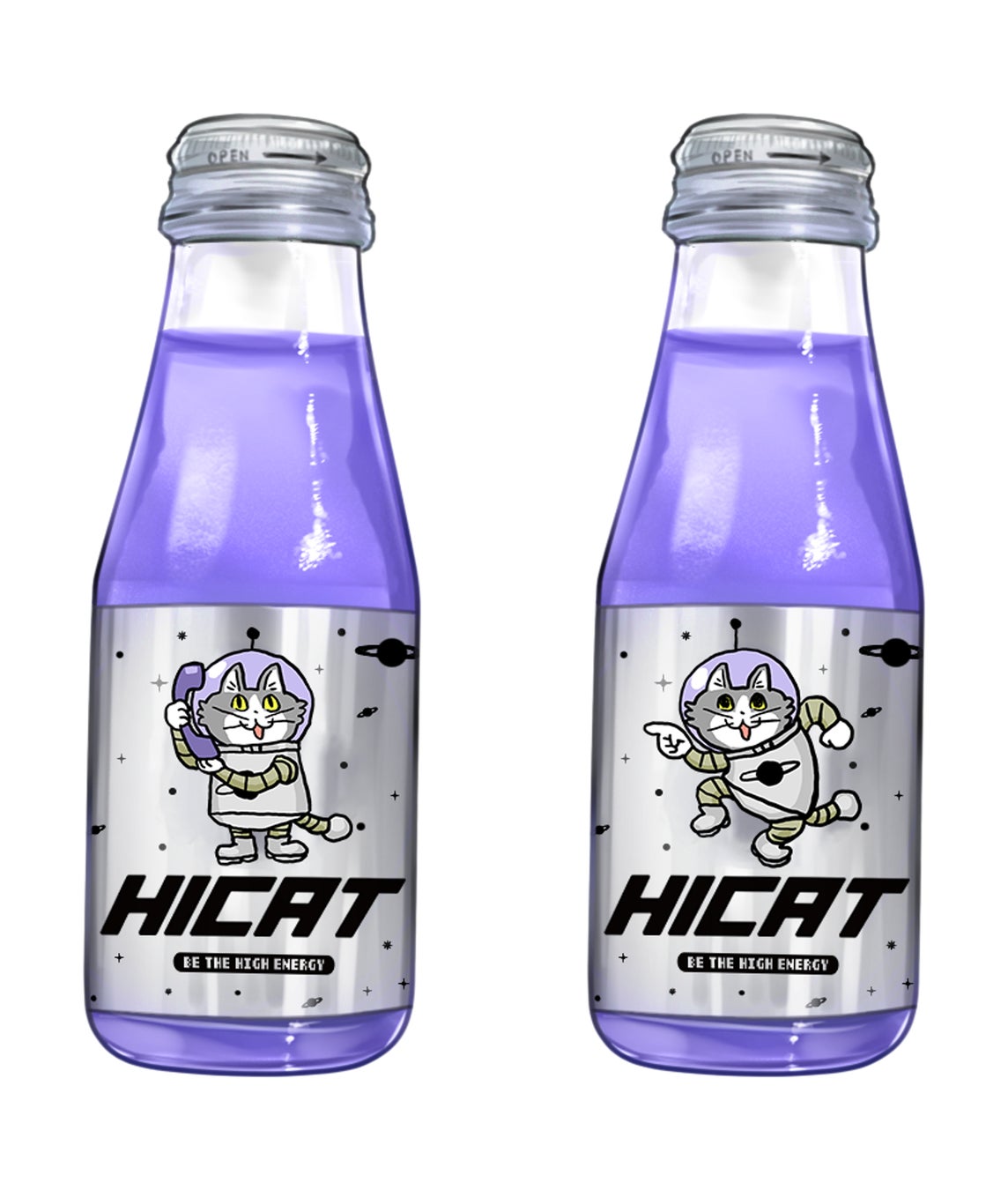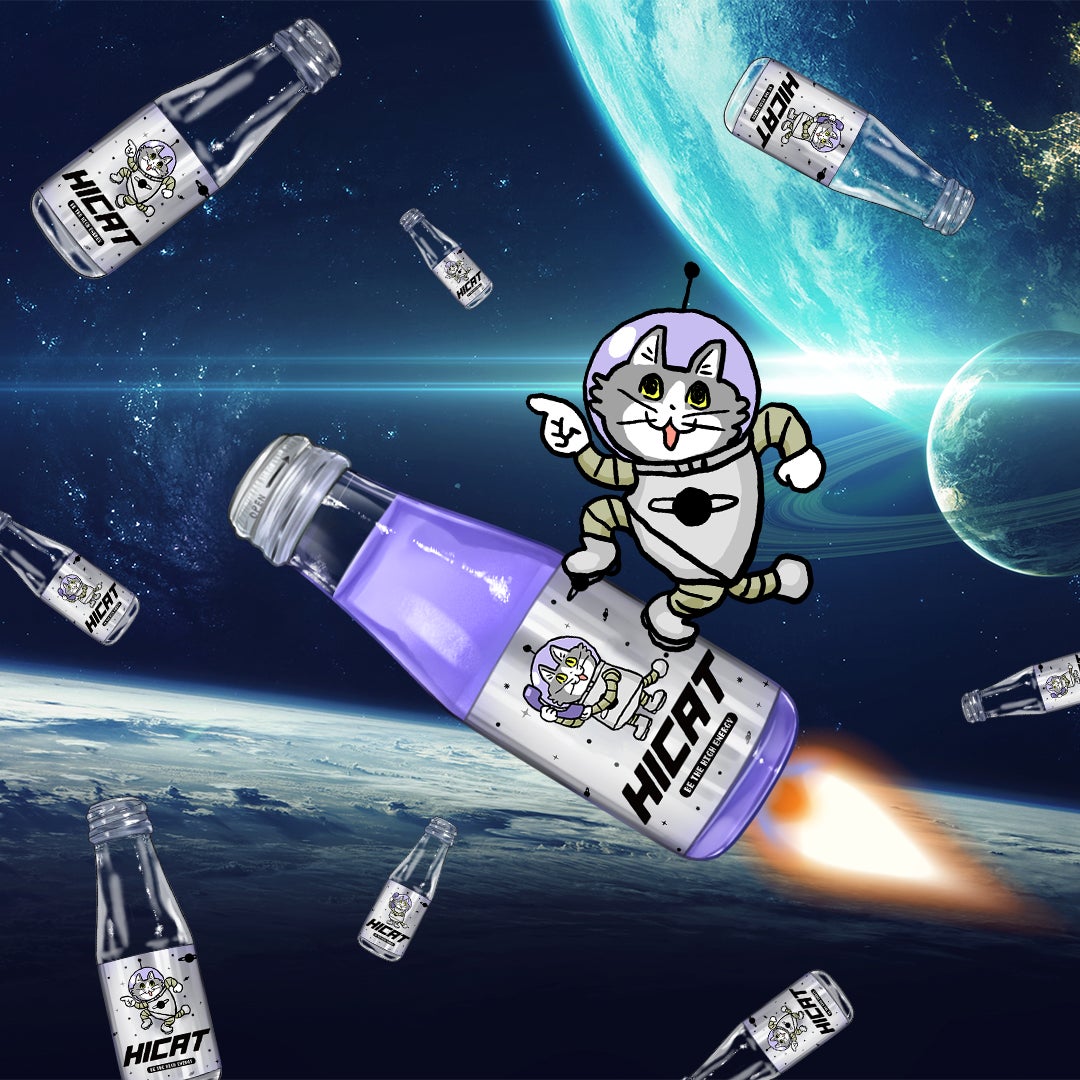 HICATは、2023年5月16日に販売を開始した、マタタビ配合のエナジードリンクです。(プレ販売は2022年12月より)瓶のボトルに紫色のドリンク、銀のラベルが特徴で、メタバース空間やデジタル感を意識した個性的なデザインになっています。フルーティーで飲みやすい微炭酸フレーバーで、カフェインを配合していないため、夜でも飲むことができます。蓋を開けた瞬間にひろがるハーブの香りにもこだわりました。
