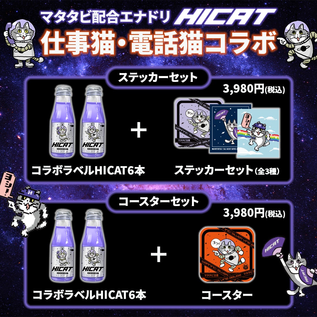 マタタビ配合エナジードリンク「HICAT」、即完売の“くまみね氏”デザイン『仕事猫』・『電話猫』とのコラボラベルセットが再販開始!