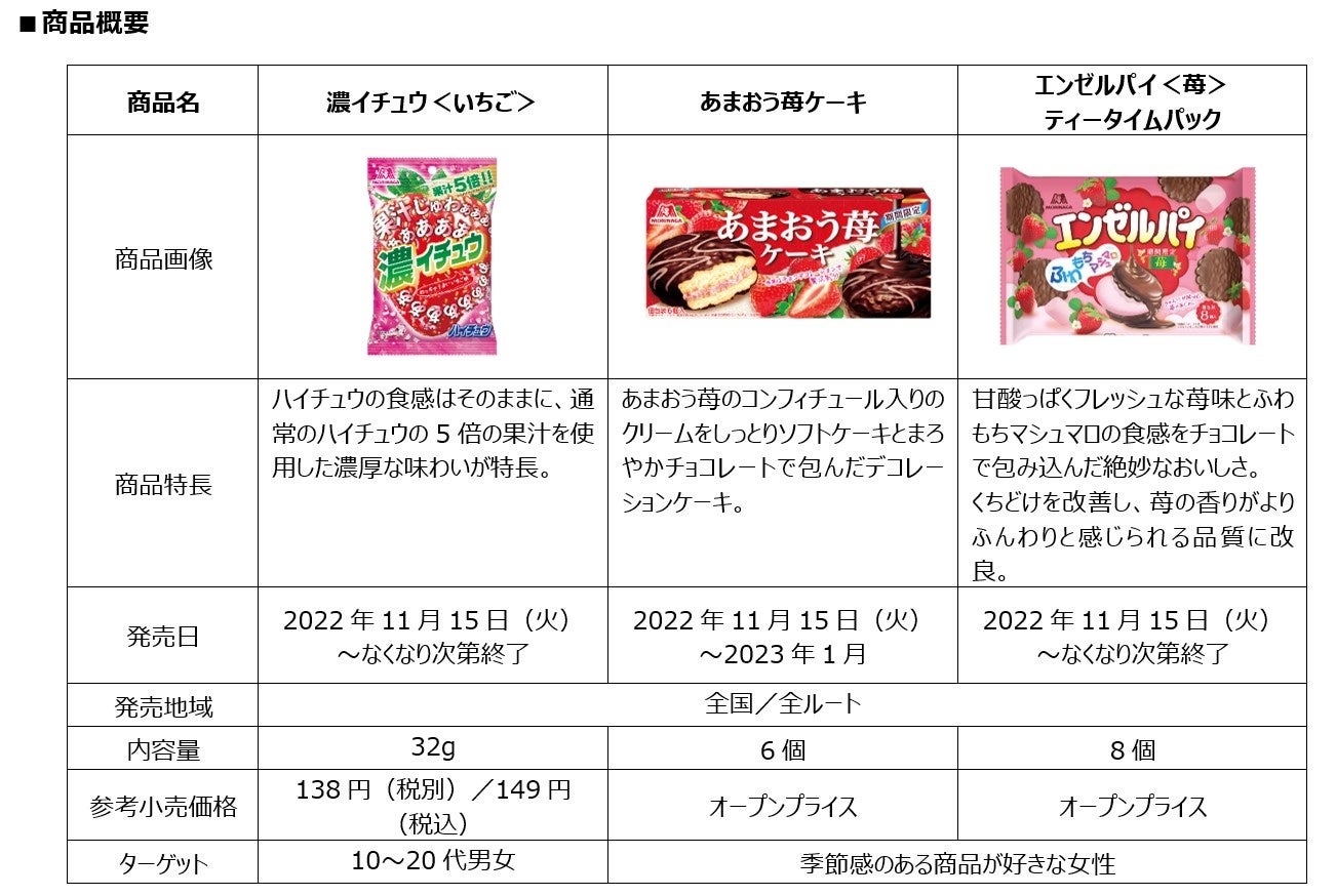 森永製菓株式会社(東京都港区芝、代表取締役社長・太田 栄二郎)は、「濃イチュウ<いちご>」「あまおう苺ケーキ」「エンゼルパイ<苺>」を11月15日(火)より、「贅沢苺の小枝」2品を11月29日(火)より期間限定で発売いたします。