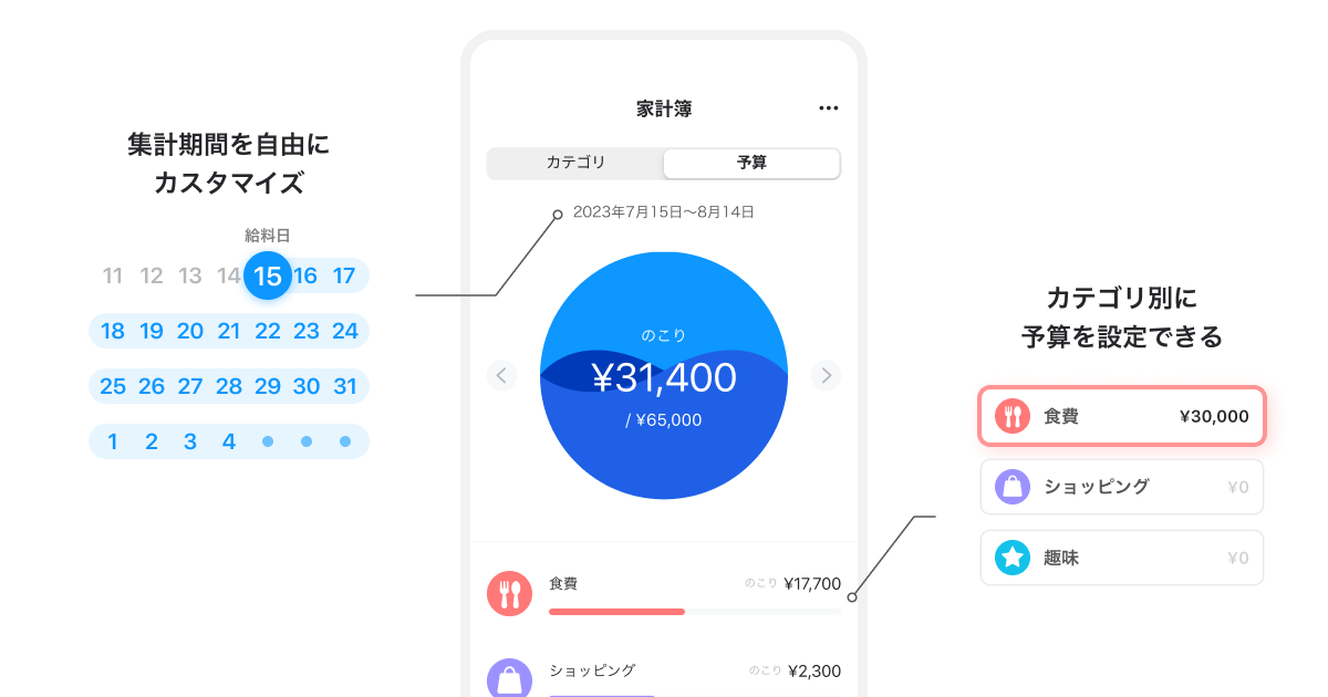 ・起算日の設定:ユーザーが集計期間の起算日を給料日など任意に指定できます
