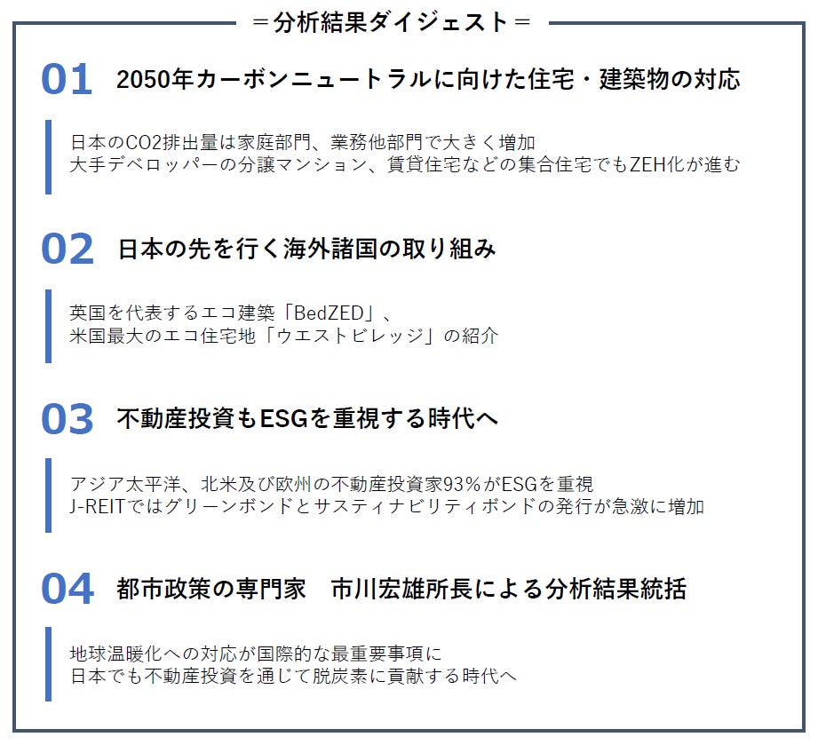 同研究所では、調査・研究の第13弾として、カーボンニュートラルに向けた住宅・建築物の国内外の対応や、ESG投資ニーズについて分析いたしました。