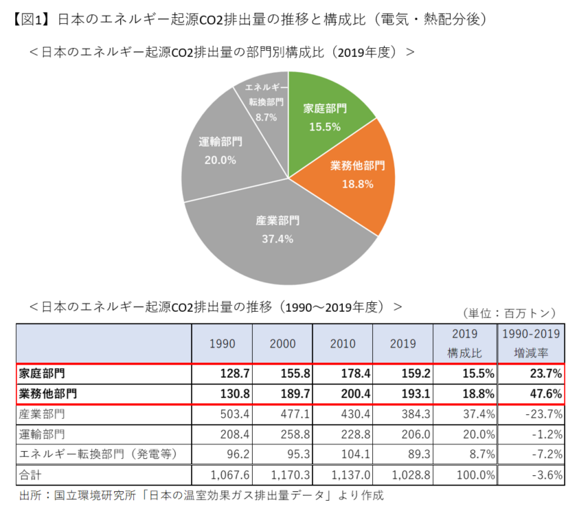 1990-2019年度の排出量増減率をみると、産業部門は23.7%減と低下したのに対し、家庭部門、業務他部門はむしろ大きく増加しました【図1】。