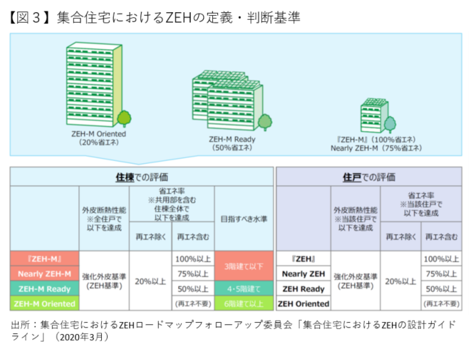 商業系ビルでZEHに相当するものがZEB(ゼブ; 「Net Zero Energy Building=ネット・ゼロ・エネルギー・ビル」の略語)であり、また、ZEHの集合住宅版として、ZEH-M(ゼッチ・マンション)の基準も設けられています【図3】(※)。