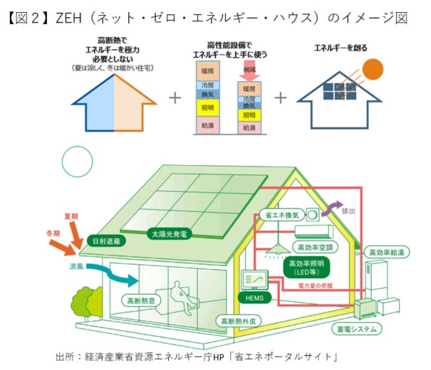 ここで、少し聞き慣れないZEH、ZEBについて説明すると、ZEH(ゼッチ)とは「Net Zero Energy House=ネット・ゼロ・エネルギー・ハウス」の略語で、「外皮の断熱性能等を大幅に向上させるとともに、高効率な設備システムの導入により、室内環境の質を維持しつつ大幅な省エネルギーを実現した上で、再生可能エネルギーを導入することにより、年間の一次エネルギー消費量の収支がゼロとすることを目指した住宅」と定義されています【図2】。