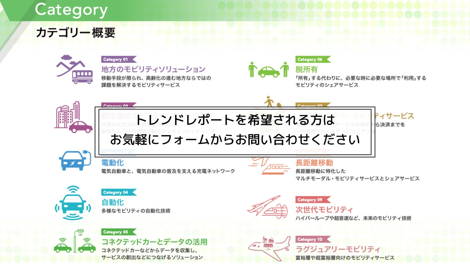EV、シェアサイクル、相乗り、ハイパーループまでを掲載した【モビリティトレンドレポート】をリリース