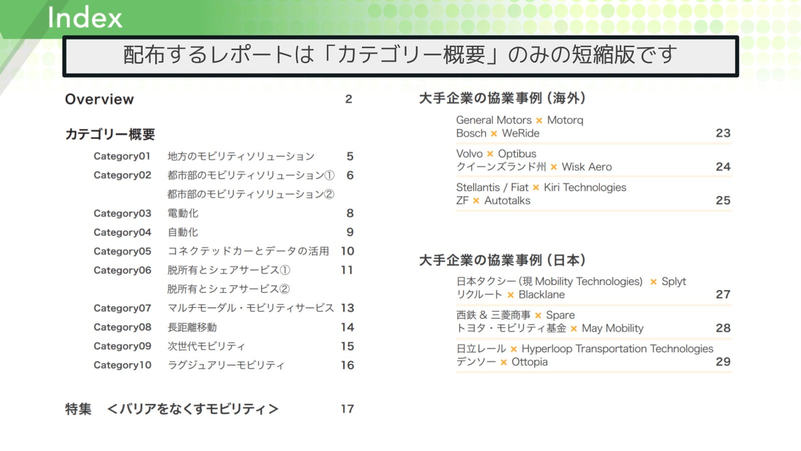 中盤では少し視野を広げ、未来のモビリティ技術や、富裕層をターゲットにしたモビリティ、そして特集では弱者に優しいモビリティソリューションの例を集めており、後半の大手企業とスタートアップの協業事例と併せてご紹介しております。