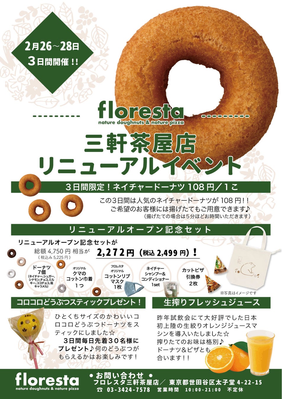 株式会社フロレスタ(本社:大阪市浪速区/代表取締役社長:辻尾吉厚)は、手作りドーナツ専門店「フロレスタ」の三軒茶屋店を2月26日(土)にリニューアルオープンいたします。