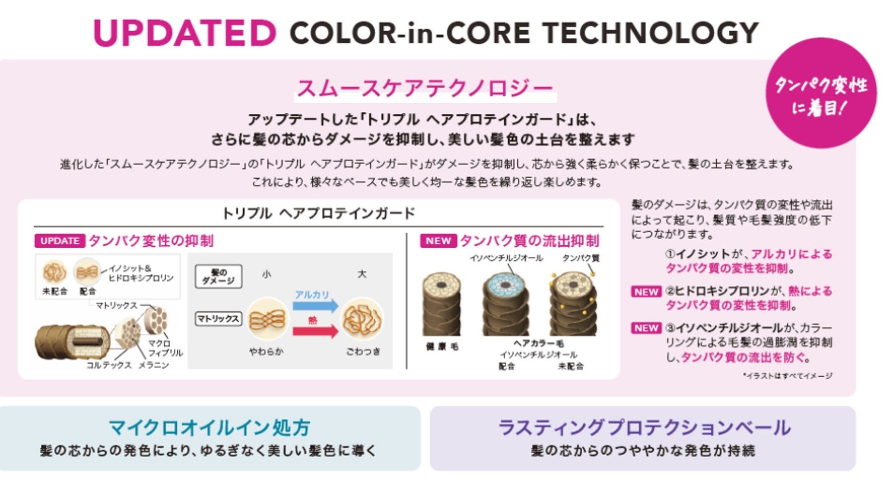 ※1カラーインコアテクノロジーとは、独自の3つの技術を総称した名称です。染毛剤に搭載。