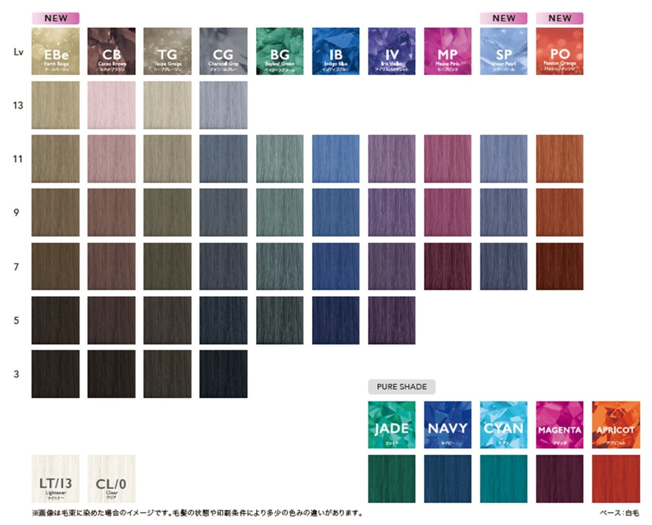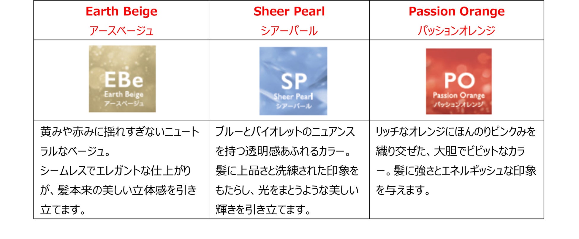 髪の芯にアプローチする独自の“COLOR-in-COREテクノロジー※1”が進化。タンパク変性に着目した新技術で、ダメージをより抑制します。髪の芯から強く柔らかく保つことで美しい髪色の土台を整えます。これにより様々なベースでも美しく均一な発色が可能になり、繰り返しヘアカラーを楽しめます。リニューアルしたラインナップでは、既存のシェードに加え、新たに3つの新色「アースベージュ(Earth Beige)」「パッションオレンジ(Passion Orange)」「シアーパール(Sheer Pearl)」を追加。ニュートラルグレーベースで毛先まで透明感のある輝く髪色を是非体感ください。