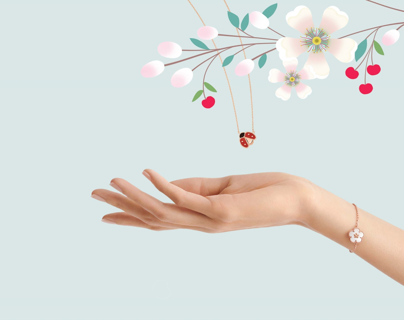 2021年に発表されたラッキー スプリング コレクションは、ヴァン クリーフ&アーペルならではの詩的な世界観とポジティブな人生観を形にしたものです。今年、メゾンが大切にしている2つのテーマ「自然」と「幸運」をひとつにした新作が、ヴァン クリーフ&アーペルの魅惑的な庭園に加わります。これらの作品では、ローズゴールド、ホワイト マザーオブパール、オニキス、カーネリアンの鮮やかなパレットが繊細なモチーフを彩り、輝きに満ちたのどかな情景を描いています。ピュアで優美な春の景色を織りなすのは、スズランの花、てんとう虫、プラムの花です。どのモチーフも、メゾンが伝えたい幸運と喜びのメッセージを表現するために、制作のプロセスを通して徹底的に吟味され、デザインされました。