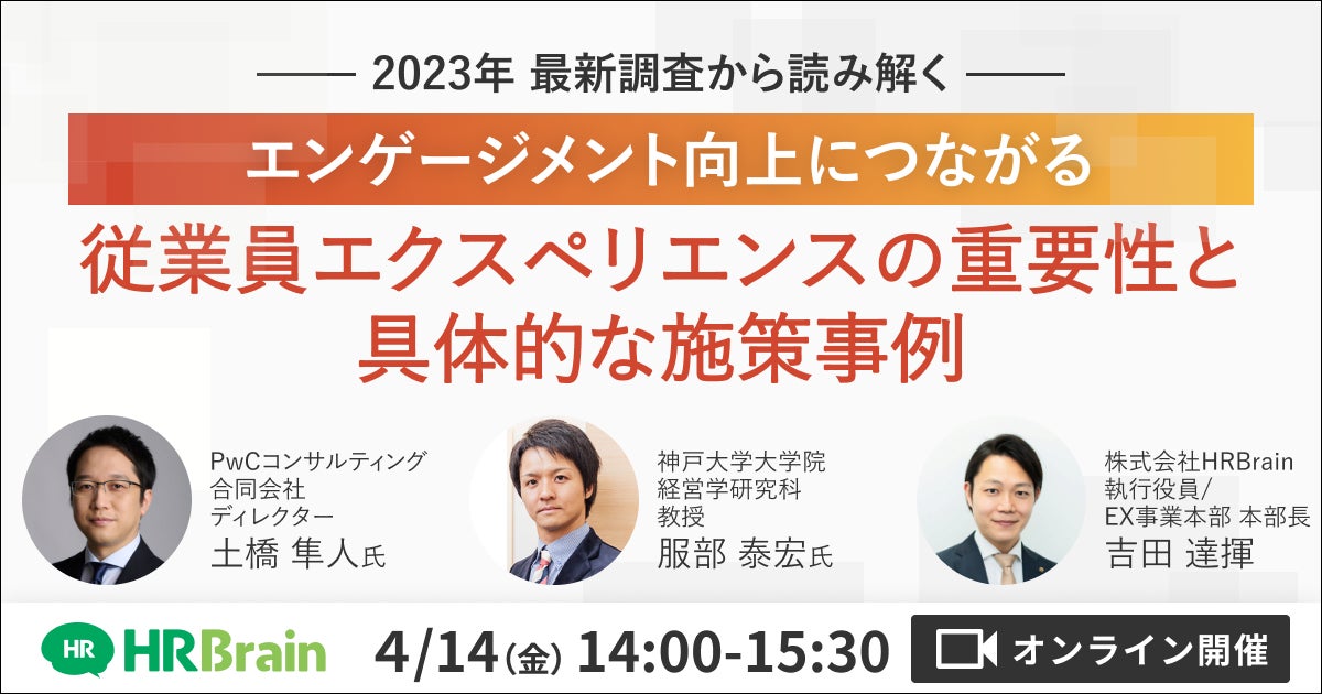 株式会社HRBrain(本社:東京都品川区/代表取締役CEO:堀 浩輝 以下、当社)は 、従業員エクスペリエンス(EX)向上における取り組み方法にお悩みの方に向けた、EXの最新トレンドを取り上げるオンラインセミナーを2023年4月14日に開催することをお知らせいたします。