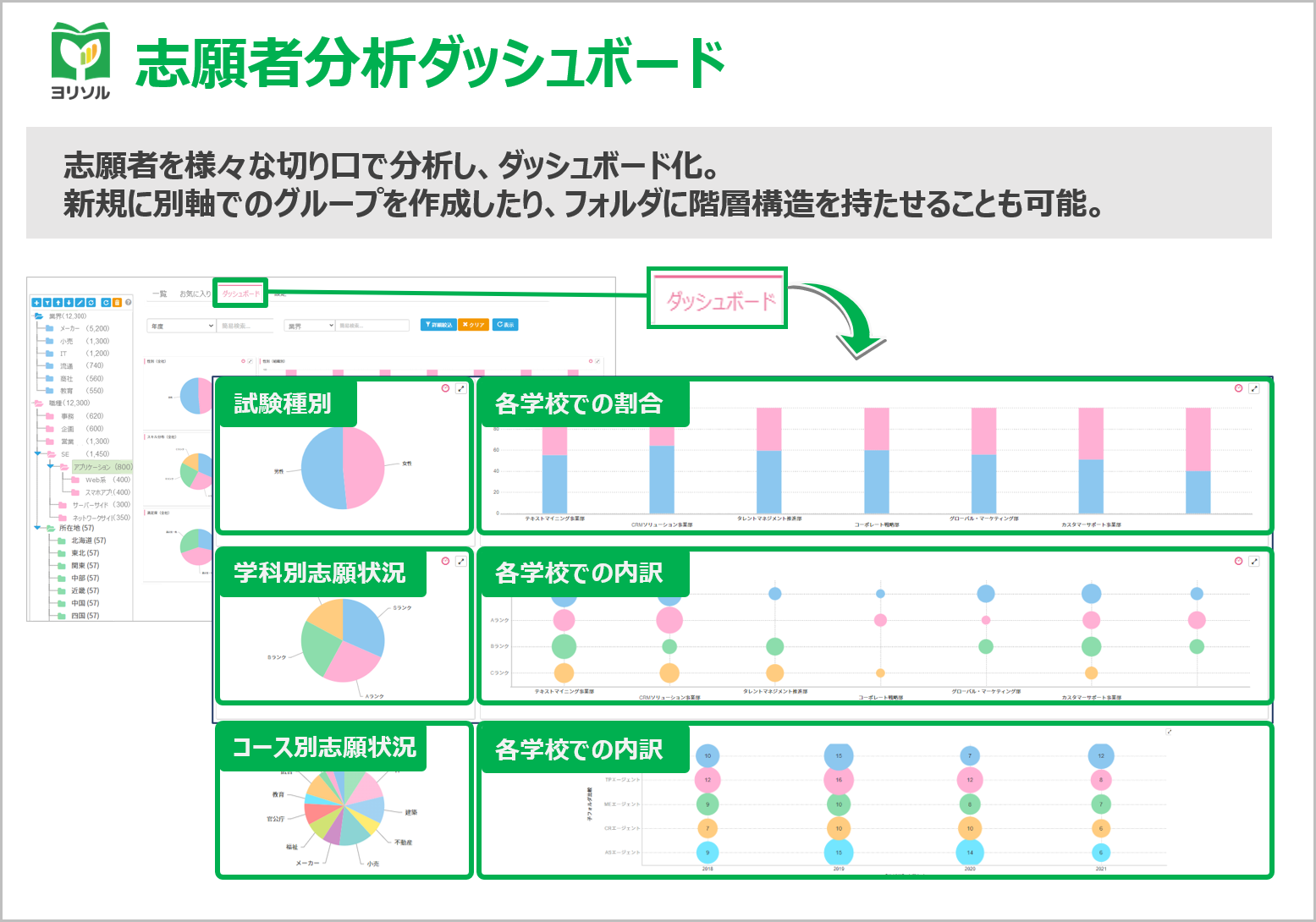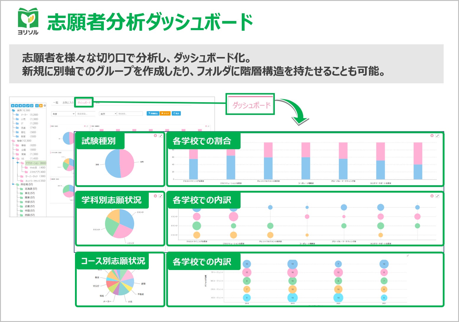 これによって蓄積される志願者データの分析ダッシュボードによって志願者傾向の見える化を実現し、広報活動等の高度化を支援します。