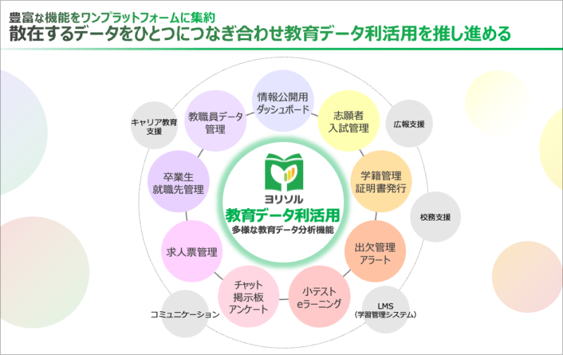 統合型スクールマネジメントシステム「ヨリソル(https://yorisoar.com/)」は、教育データの見える化から志願者管理、成績、学習記録、出欠、LMS、授業評価アンケート、退学・不登校の予兆検出まで、教育機関に必要な機能をワンプラットフォームに集約することを目指しております。