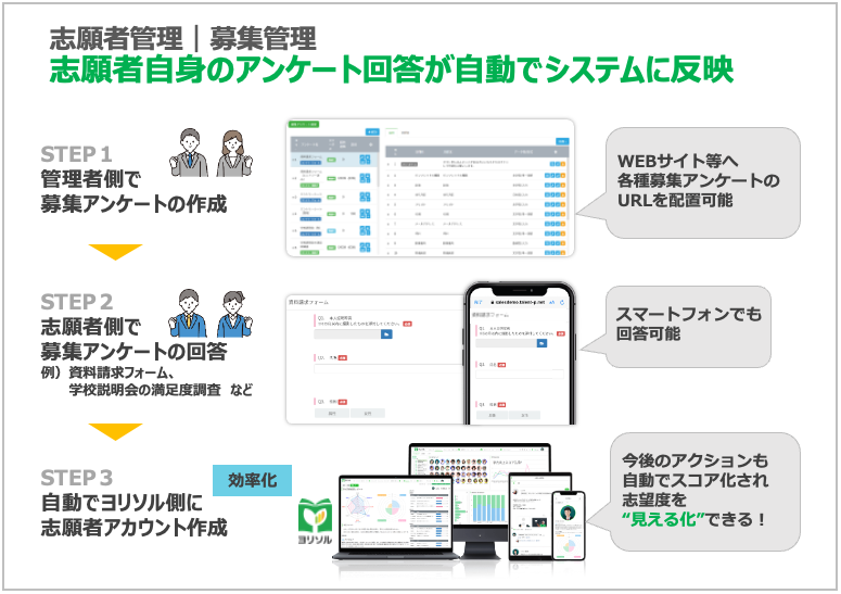 今回提供開始した志願者管理によって募集や満足度調査などの入力フォームをヨリソル(https://yorisoar.com/)に一元化することが可能です。