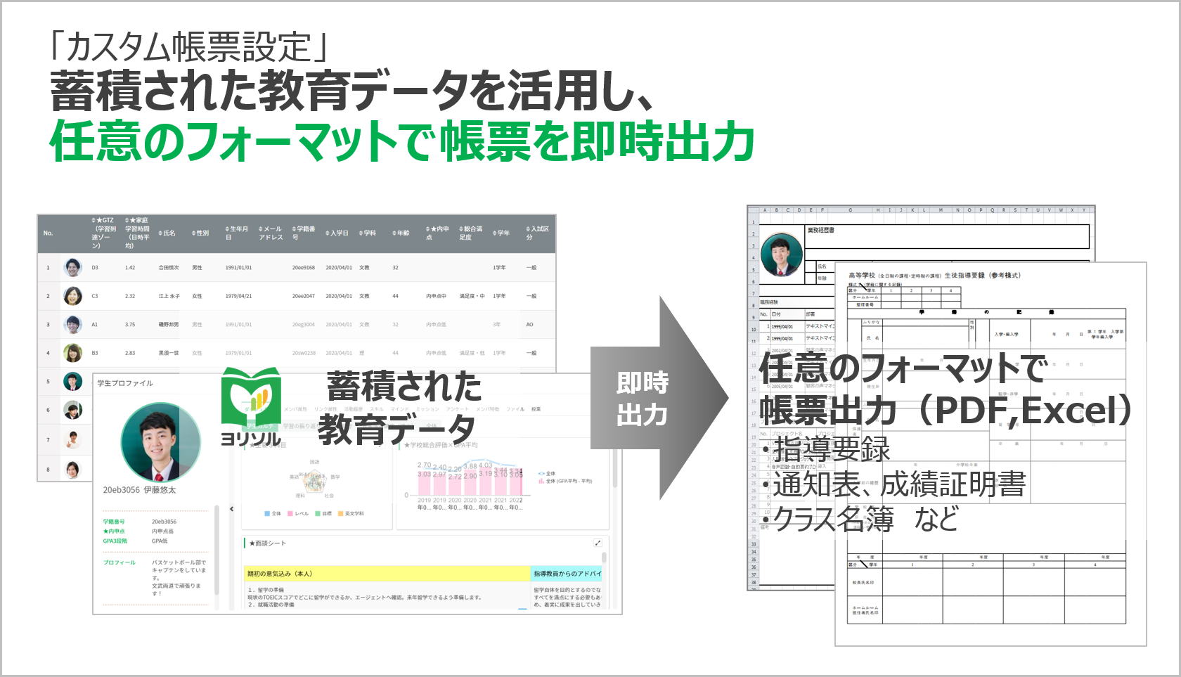 ここで蓄積された教育データを活用し、任意のフォーマットによる帳票の即時出力・発行に対応しました。