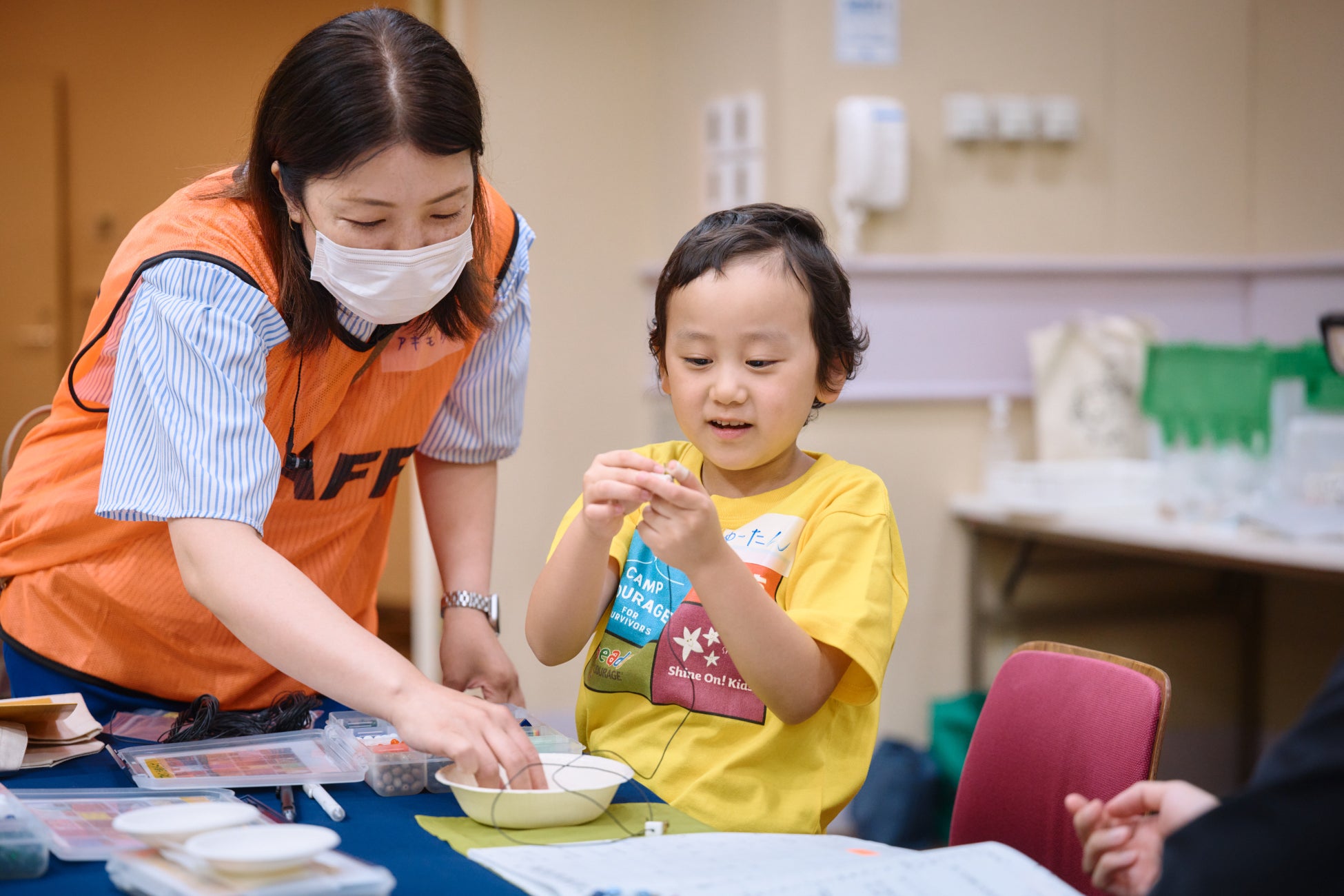 メインとなるアクティビティの「ふりかえりビーズ」は、アメリカ発祥のアート介在療法「ビーズ・オブ・カレッジ」の一種。がん治療の処置や治療を意味するビーズをつなぐことを通して、自分が乗り越えてきた治療を振り返り、自己肯定感の醸成を目指します。入院先の病院では導入がなかったり、治療時に幼くて参加できなかった子ども達にとって、初めて治療した自分と向き合う時間となります。