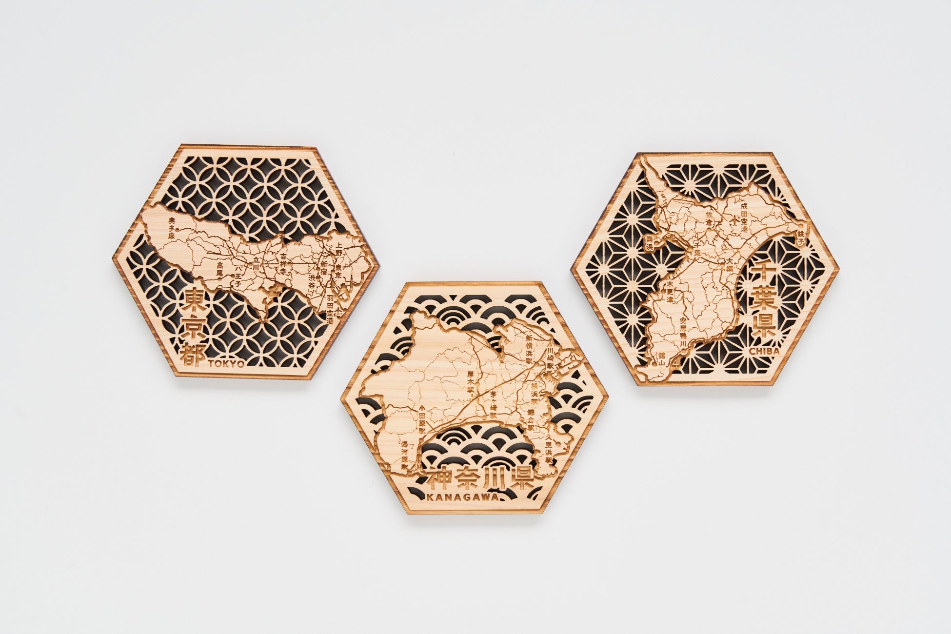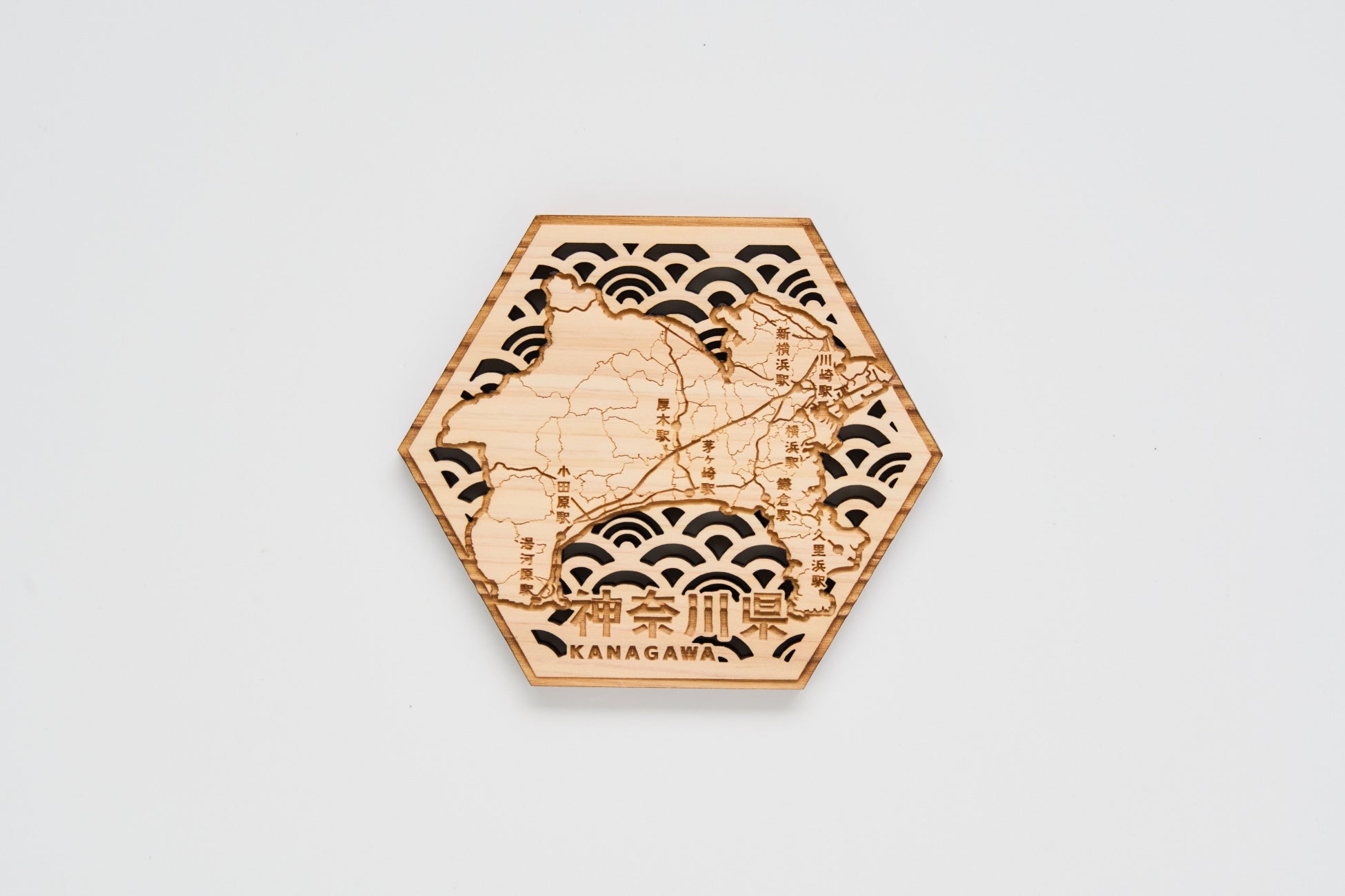 国産のヒノキを使用。良い香りが漂い、日本を感じていただけるシリーズのコースター。ヒノキの木目の美しさと温もりを感じつつ、詳細に刻印された地図を楽しめるデザインになっています。神奈川県エリアをモチーフにしたデザインは、新商品となります。