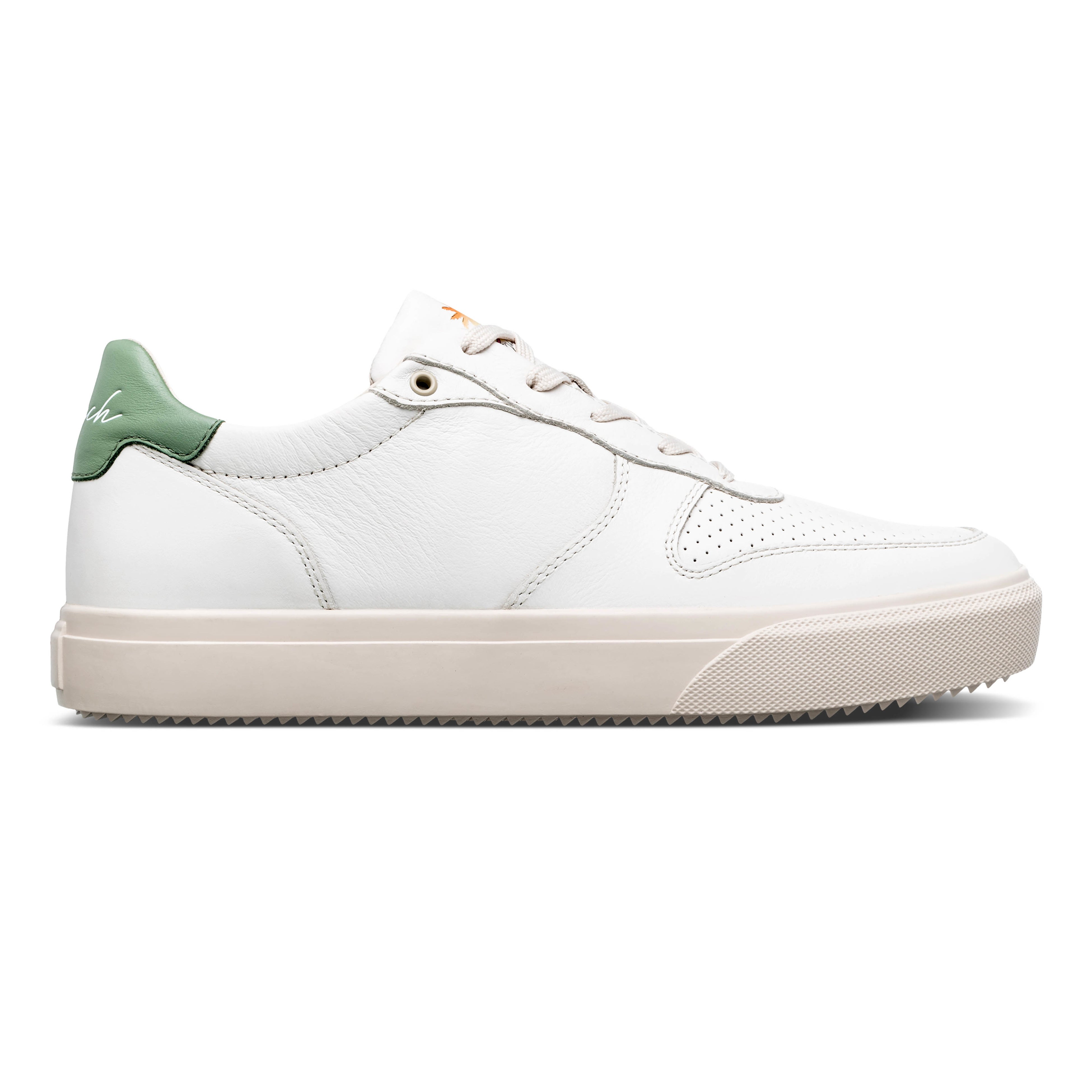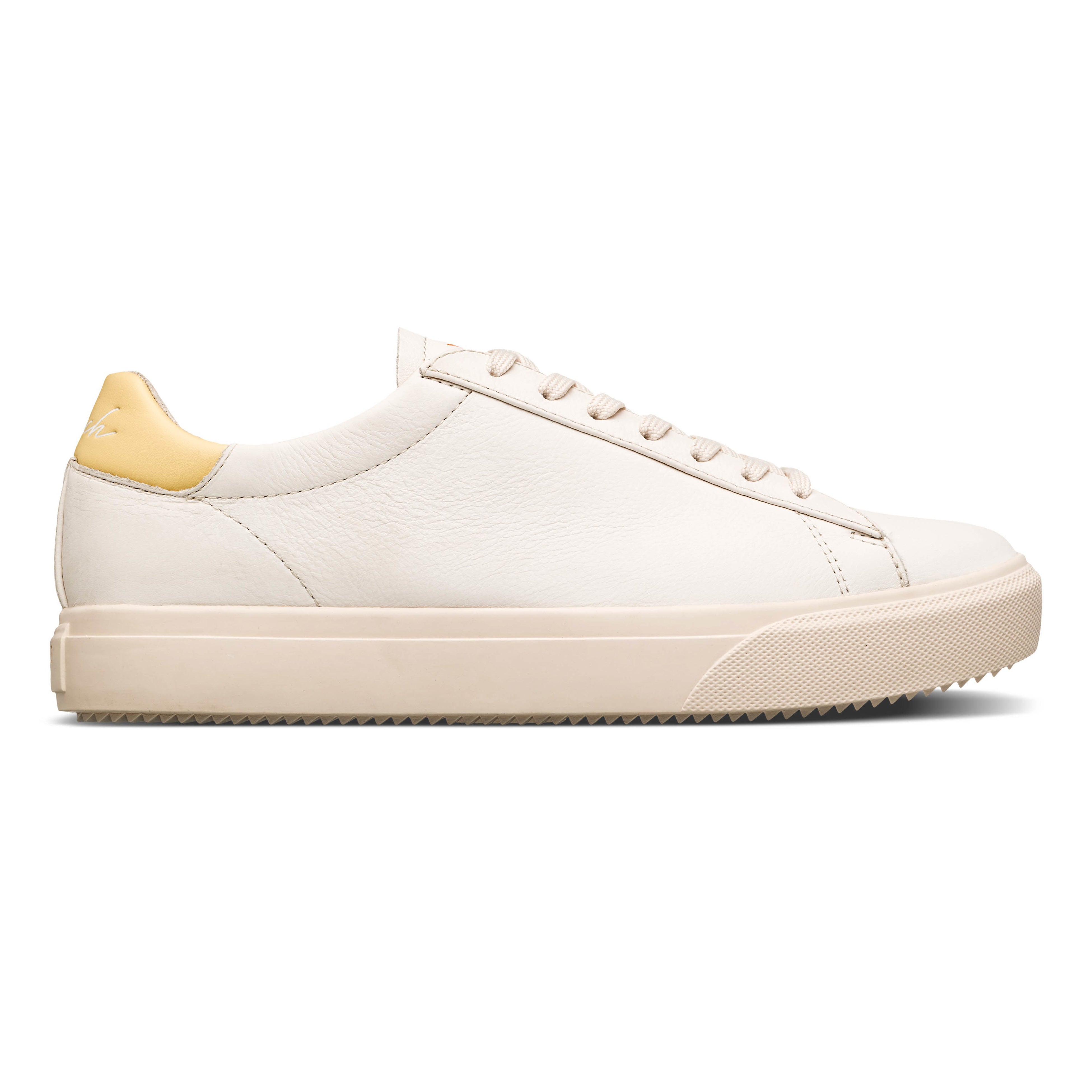 上質なイタリアンレザーの柔らかいシボ感とヒールタブの淡いイエローがメロウなムード。アッパーの眩しいホワイトを受け止めるアイボリーのソールも雰囲気を引き立てます。