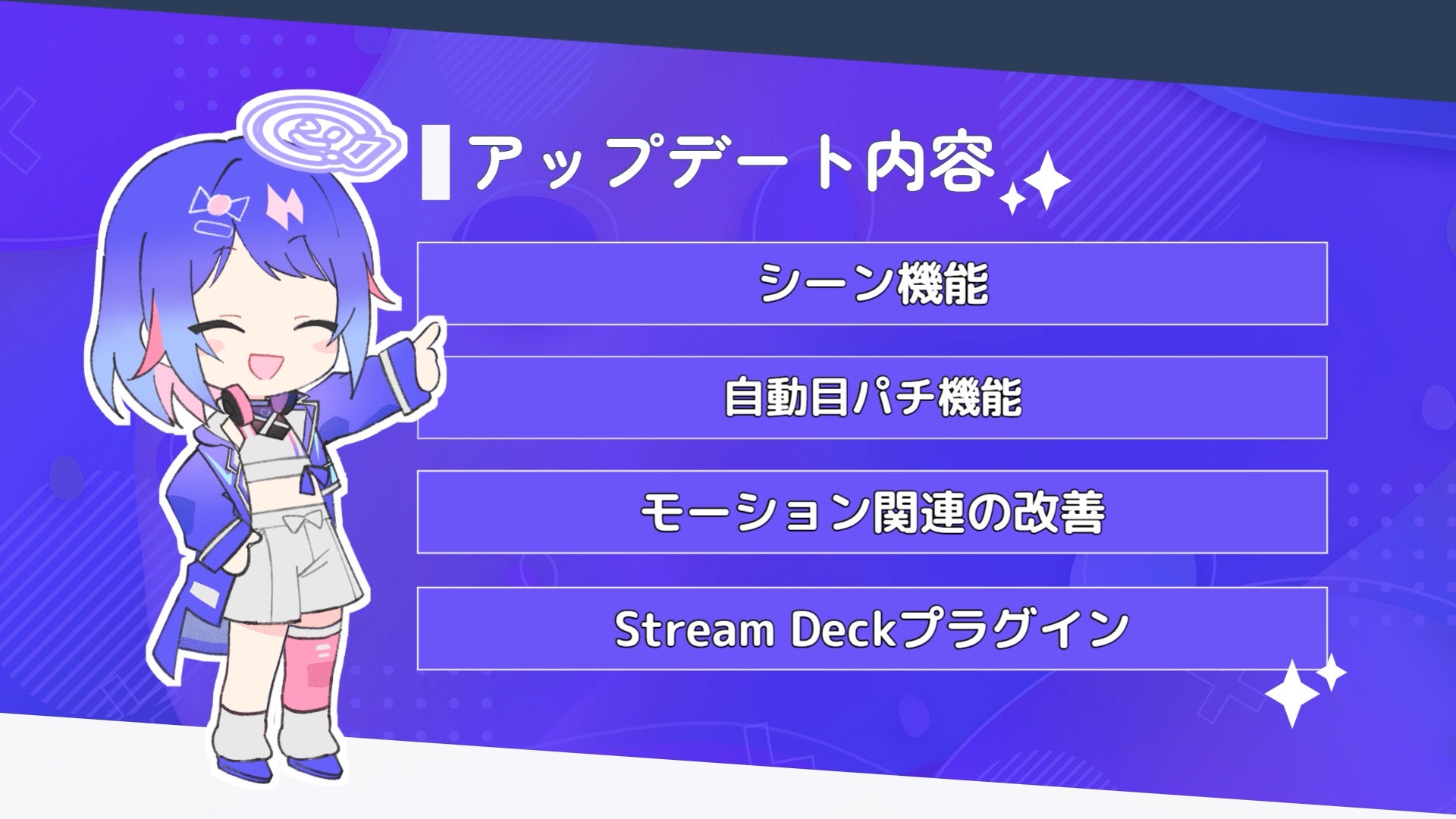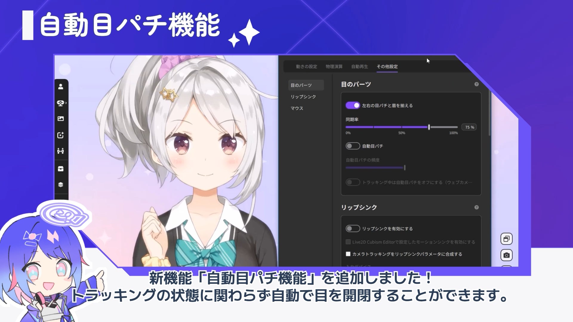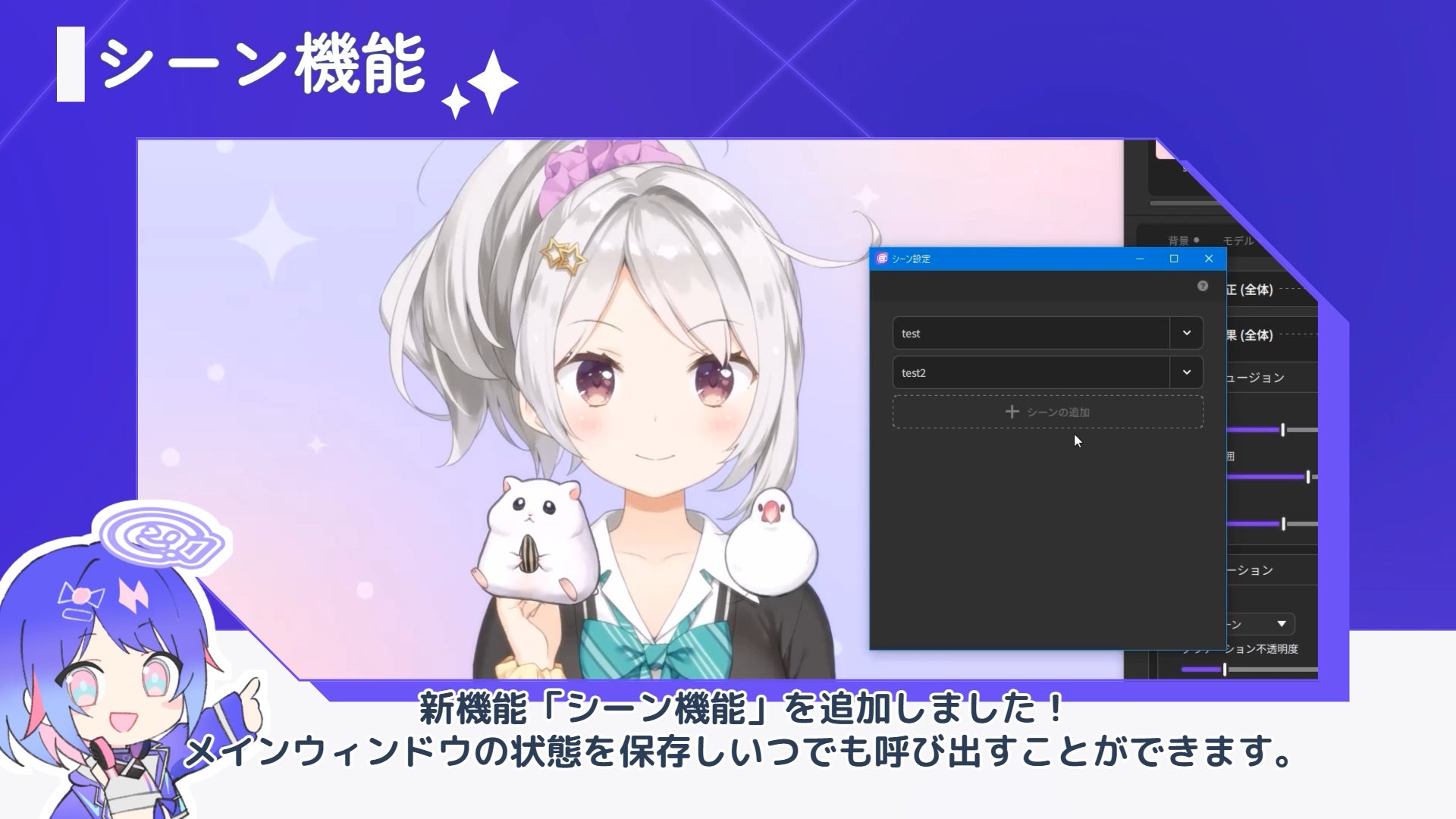 新機能「シーン機能」や「自動目パチ機能」など、より多くのユーザーがLive2D表現を楽しめる新機能を追加