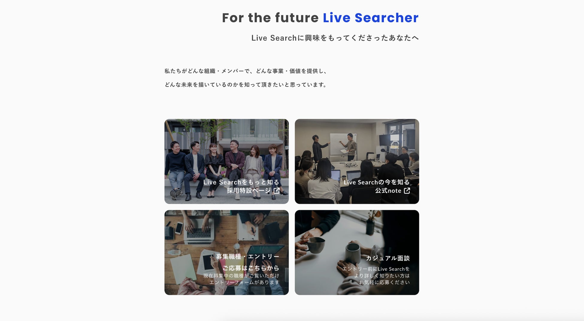 採用ピッチ資料の公開やメンバーインタビュー動画など、より多くの方々にLive Searchを知っていただけるためのコンテンツを随時更新していく予定です。