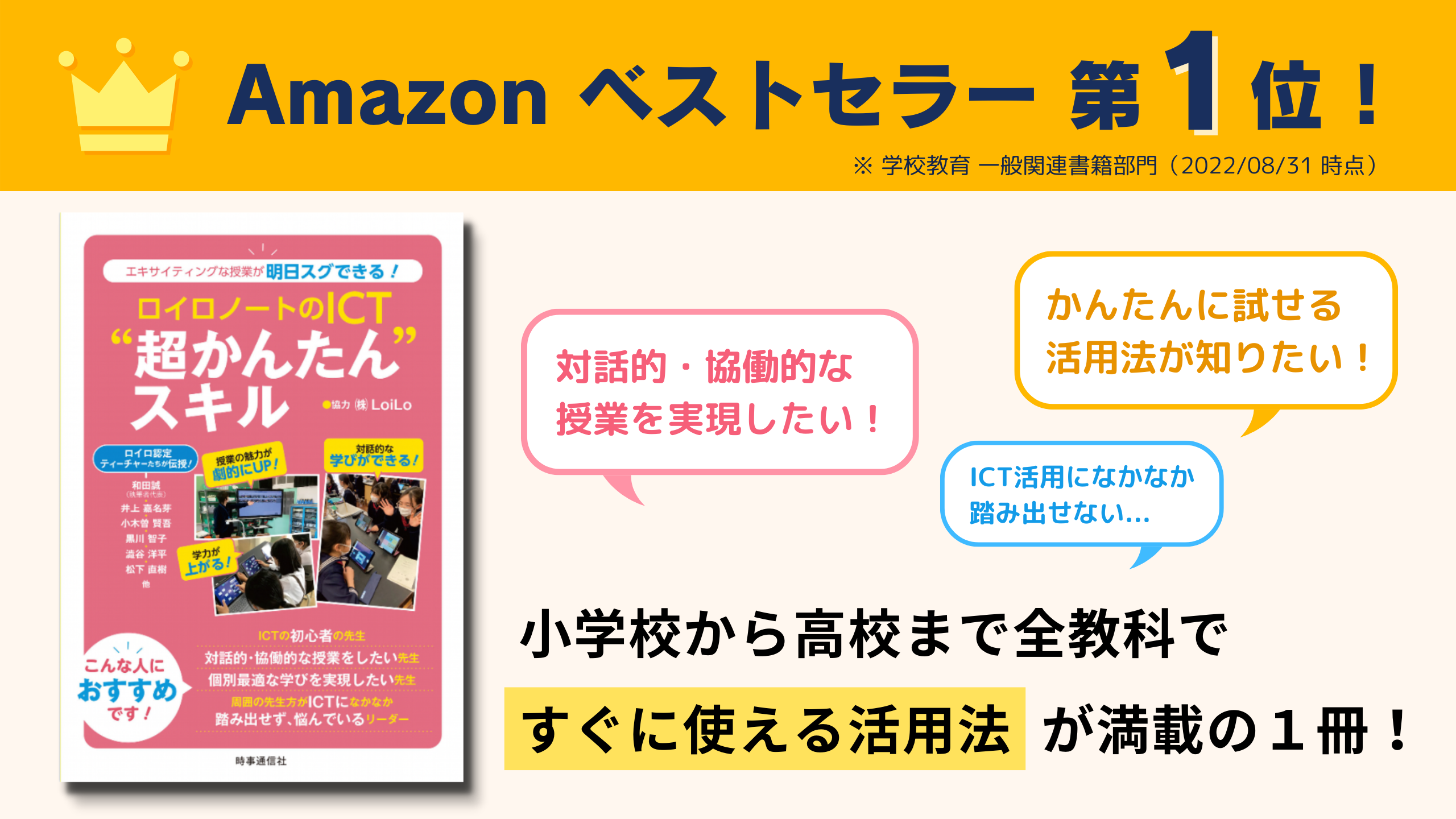 2022年8月16日に時事通信社より出版された書籍『ロイロノートのICT”超かんたん”スキル』がAmazonでベストセラー第1位を記録しました(学校教育一般関連書籍部門 2022年8月31日時点)。